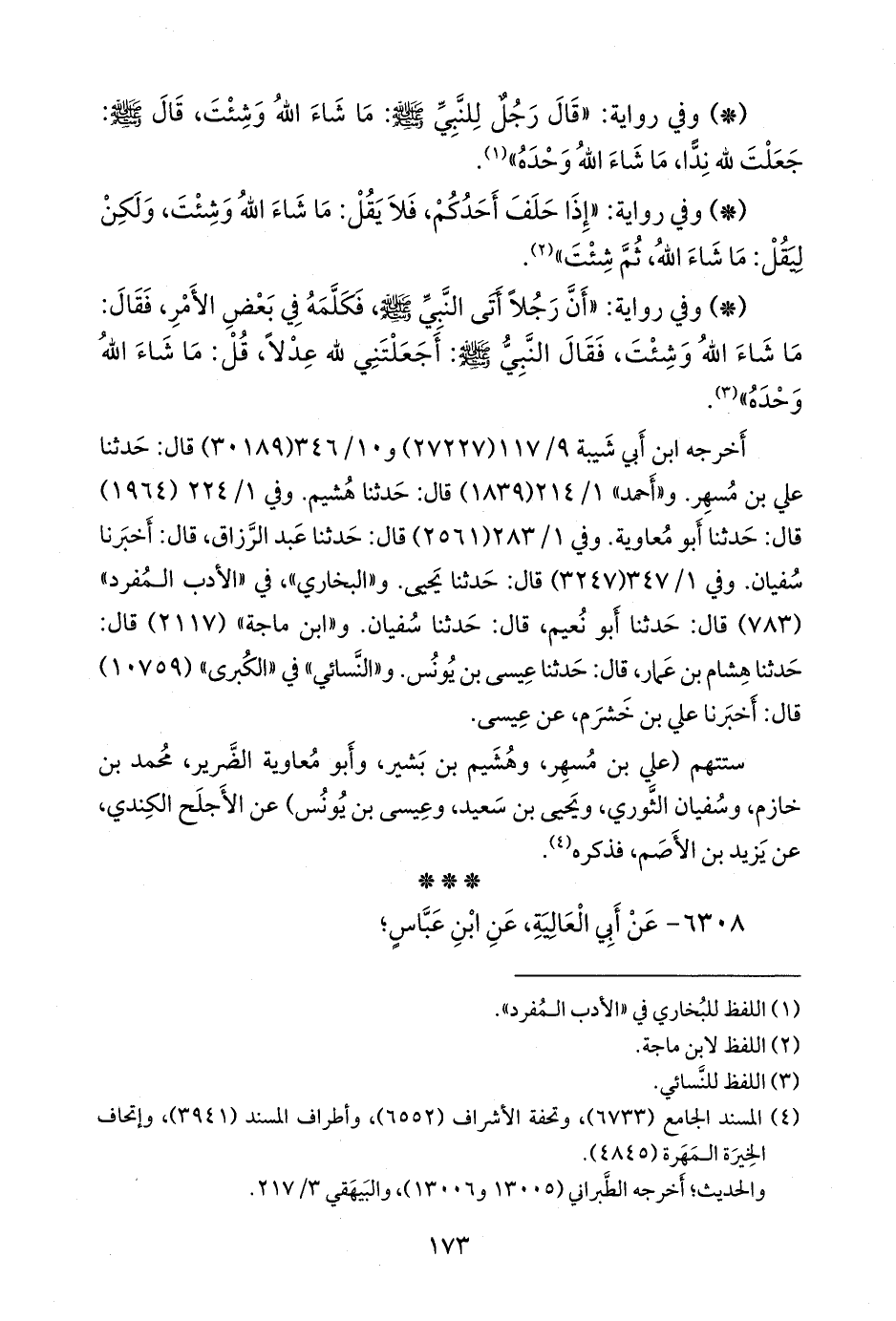 - وفي رواية: «أن رجلا أتى النبي صَلى الله عَليه وسَلم , فكلمه في بعض الأمر, فقال: ما شاء الله وشئت, فقال النبي صَلى الله عَليه وسَلم: أجعلتني لله عدلا, قل: ما شاء الله وحده» (¬١).
