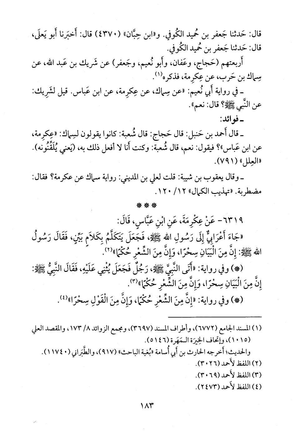 - وفي رواية: «أتى النبي صَلى الله عَليه وسَلم , رجل فجعل يثني عليه, فقال النبي صَلى الله عَليه وسَلم: إن من البيان سحرا, وإن من الشعر حكما» (¬٢).