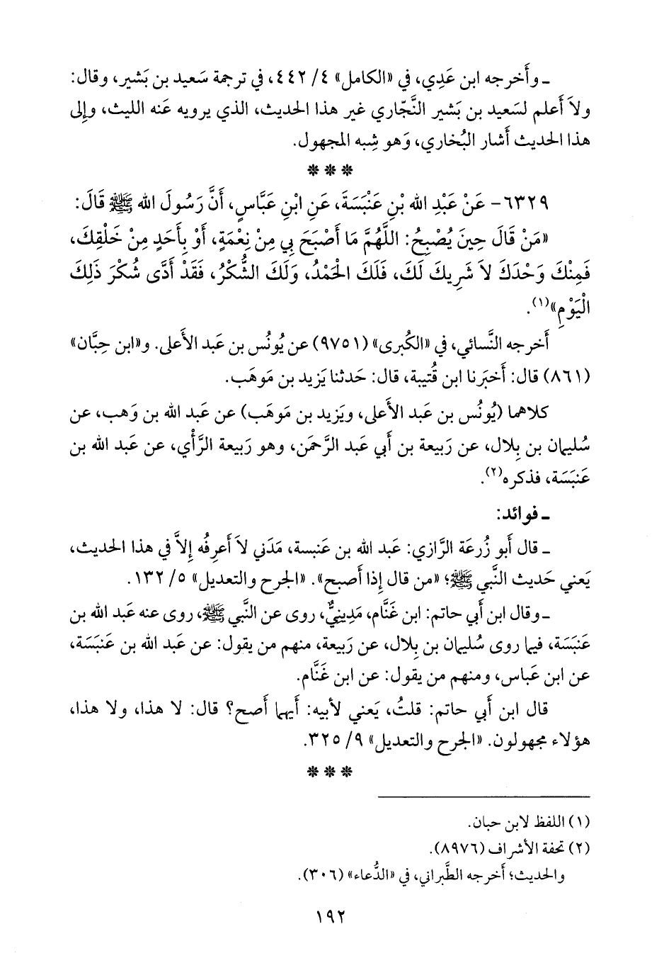 - قلنا: إِسناده ضعيفٌ؛ قال أَبو زُرعَة الرازي: عبد الله بن عنبسة، مدني لا أعرفه إلا في هذا الحديث، يعني حديث النبي صَلى الله عَليه وسَلم؛ «من قال إذا أصبح». «الجرح والتعديل» ٥/ ١٣٢.