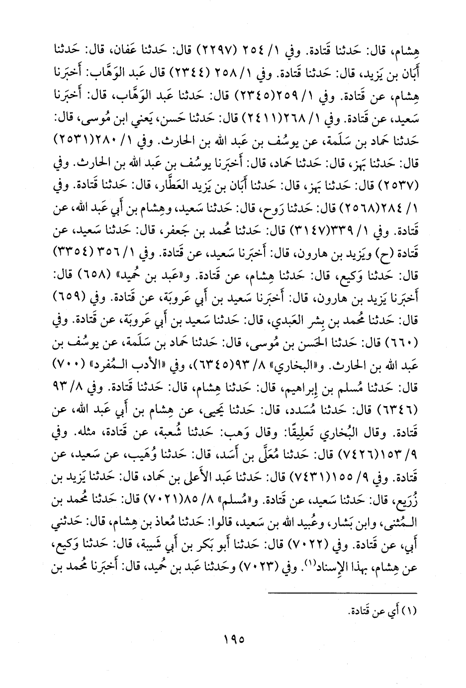 وفي ١/ ٢٥٤ (٢٢٩٧) قال: حدثنا عفان، قال: حدثنا أَبَان بن يزيد، قال: حدثنا قتادة. وفي ١/ ٢٥٨ (٢٣٤٤) قال عبد الوَهَّاب: أخبرنا هشام، عن قتادة. وفي ١/ ٢٥٩ (٢٣٤٥) قال: حدثنا عبد الوَهَّاب، قال: أخبرنا سعيد، عن قتادة. وفي ١/ ٢٦٨ (٢٤١١) قال: حدثنا حسن، يعني ابن موسى، قال: حدثنا حماد بن سلمة، عن يوسف بن عبد الله بن الحارث. وفي ١/ ٢٨٠ (٢٥٣١) قال: حدثنا بَهز، قال: حدثنا حماد, قال: أخبرنا يوسف بن عبد الله بن الحارث. وفي (٢٥٣٧) قال: حدثنا بَهز، قال: حدثنا أَبَان بن يزيد العطار، قال: حدثنا قتادة. وفي ١/ ٢٨٤ (٢٥٦٨) قال: حدثنا روح، قال: حدثنا سعيد، وهشام بن أبي عبد الله, عن قتادة. وفي ١/ ٣٣٩ (٣١٤٧) قال: حدثنا محمد بن جعفر، قال: حدثنا سعيد، عن قتادة (ح) ويزيد بن هارون, قال: أخبرنا سعيد، عن قتادة. وفي ١/ ٣٥٦ (٣٣٥٤) قال: حدثنا وكيع، قال: حدثنا هشام، عن قتادة. و «عَبد بن حُميد» (٦٥٨) قال: أخبرنا يزيد بن هارون، قال: أخبرنا سعيد بن أبي عَروبَة، عن قتادة. وفي (٦٥٩) قال: حدثنا محمد بن بشر العبدي، قال: حدثنا سعيد بن أبي عَروبَة، عن قتادة. وفي (٦٦٠) قال: حدثنا الحسن بن موسى، قال: حدثنا حماد بن سلمة، عن يوسف بن عبد الله بن الحارث. و «البخاري» ٨/ ٧٥ (٦٣٤٥)، وفي «الأدب المفرد» (٧٠٠) قال: حدثنا مسلم بن إبراهيم، قال: حدثنا هشام، قال: حدثنا قتادة. وفي ٨/ ٧٥ (٦٣٤٦) قال: حدثنا مُسدد، قال: حدثنا يحيى، عن هشام بن أبي عبد الله, عن قتادة. وقال البخاري تعليقا: وقال وهب: حدثنا شعبة، عن قتادة، مثله. وفي ٩/ ١٢٦ (٧٤٢٦) قال: حدثنا مُعَلى بن أسد، قال: حدثنا وهيب، عن سعيد، عن قتادة. وفي ٩/ ١٢٦ (٧٤٣١) قال: حدثنا عبد الأعلى بن حماد، قال: حدثنا يزيد بن زُريع، قال: حدثنا سعيد، عن قتادة. و «مسلم» ٨/ ٨٥ (٧٠٢١) قال: حدثنا محمد بن المثنى، وابن بشار، وعُبيد الله بن سعيد, قالوا: حدثنا معاذ بن هشام، قال: حدثني أبي، عن قتادة. وفي (٧٠٢٢) قال: حدثنا أَبو بكر بن أبي شيبة، قال: حدثنا وكيع، عن هشام، بهذا الإسناد (¬١). وفي (٧٠٢٣) وحدثنا عَبد بن حُميد، قال: أخبرنا محمد بن