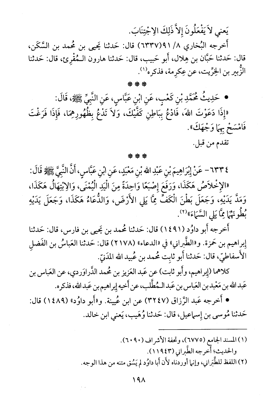 «الإخلاص هكذا، ورفع إصبعا واحدة من اليد اليمنى، والابتهال هكذا، ومد يديه، وجعل بطن الكف مما يلي الأرض، والدعاء هكذا، وجعل يديه بطونهما مما يلي السماء» (¬١).
