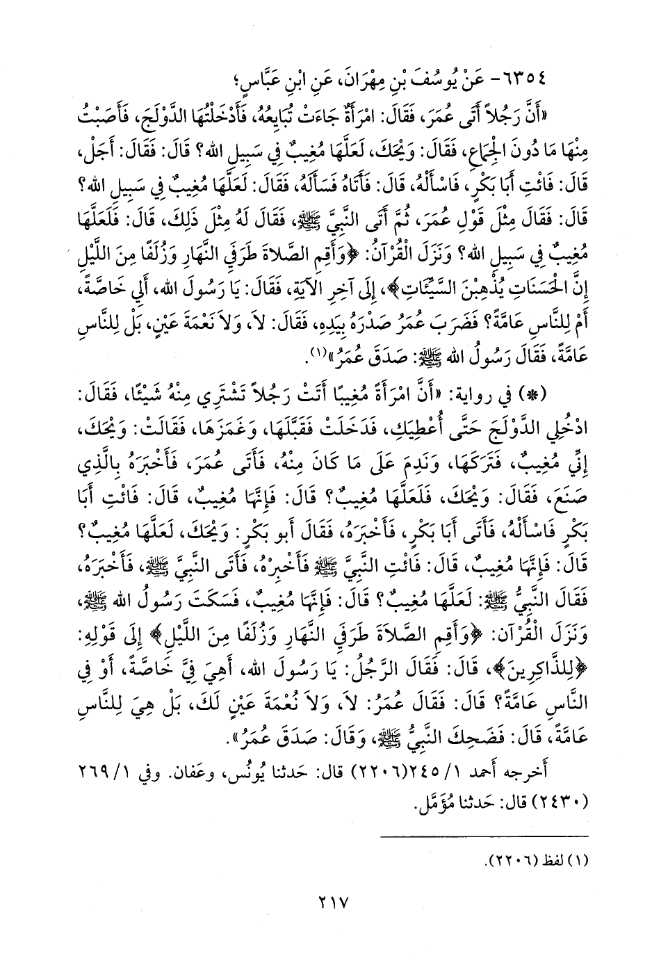 - وفي رواية: «أن امرأة مغيبا أتت رجلا تشتري منه شيئا، فقال: ادخلي الدولج حتى أعطيك، فدخلت فقبلها، وغمزها، فقالت: ويحك، إني مغيب، فتركها، وندم على ما كان منه، فأتى عمر، فأخبره بالذي صنع، فقال: ويحك، فلعلها مغيب؟ قال: فإنها مغيب، قال: فائت أبا بكر فاسأله، فأتى أبا بكر، فأخبره، فقال أَبو بكر: ويحك، لعلها مغيب؟ قال: فإنها مغيب، قال: فائت النبي صَلى الله عَليه وسَلم فأخبره، فأتى النبي صَلى الله عَليه وسَلم فأخبره، فقال النبي صَلى الله عَليه وسَلم: لعلها مغيب؟ قال: فإنها مغيب، فسكت رسول الله صَلى الله عَليه وسَلم ونزل القرآن: {وأقم الصلاة طرفي النهار وزلفا من الليل} إلى قوله: {للذاكرين}، قال: فقال الرجل: يا رسول الله، أهي في خاصة، أو في الناس عامة؟ قال: فقال عمر: لا، ولا نعمة عين لك، بل هي للناس عامة، قال: فضحك النبي صَلى الله عَليه وسَلم وقال: صدق عمر».