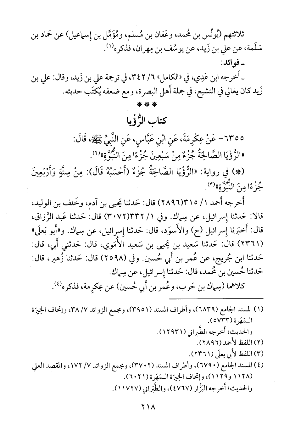 (¬٣) المسند الجامع (٦٧٩٠)، وأطراف المسند (٣٧٠٢)، ومَجمَع الزوائد ٧/ ١٧٢، والمقصد العَلي (١١٢٨ و ١١٢٩)، وإتحاف الخِيرَة المَهَرة (٦٠٢١).
