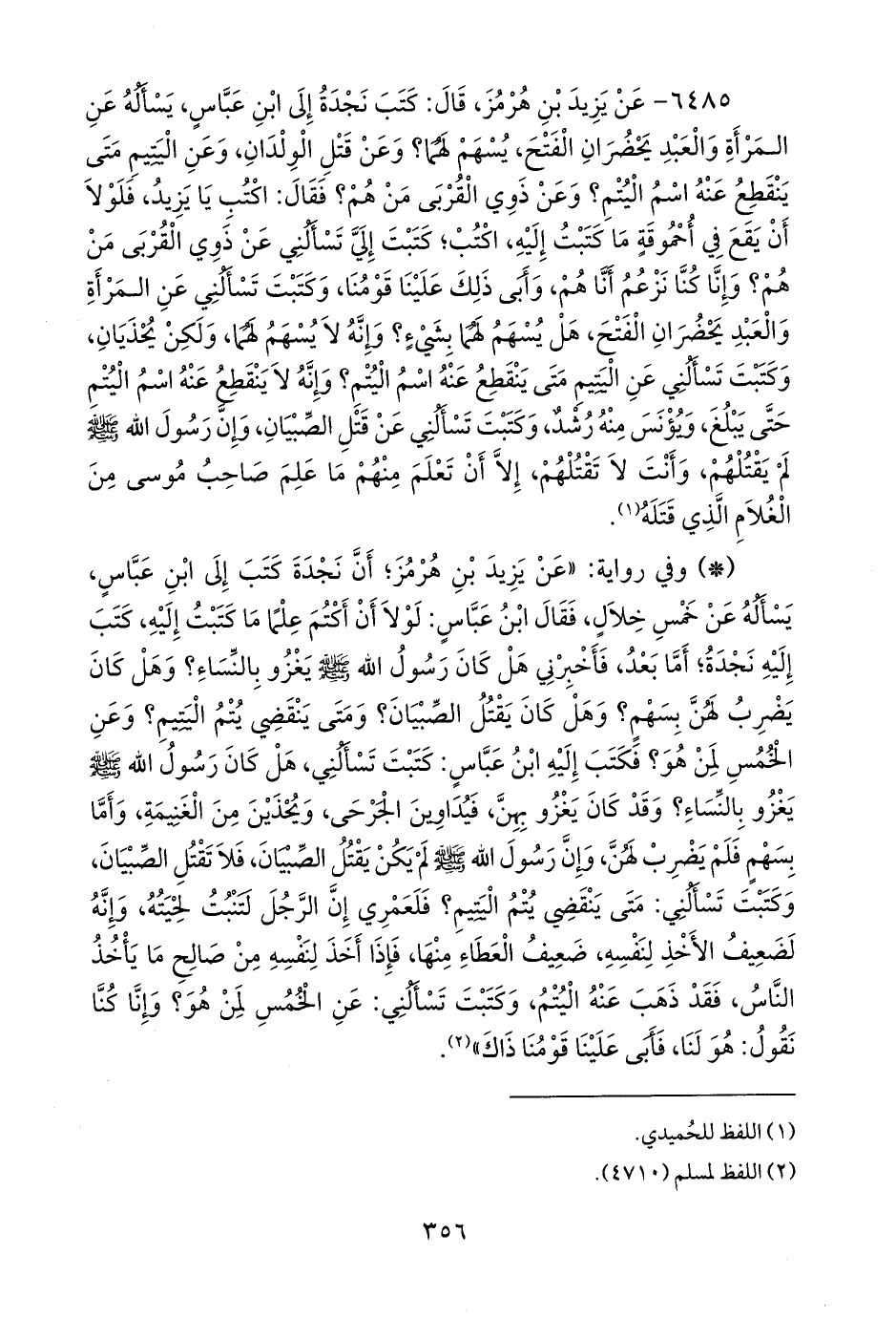 ٦٤٨٥ - عن يزيد بن هُرمُز، قال: كتب نجدة إلى ابن عباس، يسأله عن المرأة والعبد يحضران الفتح، يسهم لهما؟ وعن قتل الولدان، وعن اليتيم متى ينقطع عنه اسم اليتم؟ وعن ذوي القربى من هم؟ فقال: اكتب يا يزيد، فلولا أن يقع في أحموقة ما كتبت إليه، اكتب؛ كتبت إلي تسألني عن ذوي القربى من هم؟ وإنا كنا نزعم أنا هم، وأبى ذلك علينا قومنا، وكتبت تسألني عن المرأة والعبد يحضران الفتح، هل يسهم لهما بشيء؟ وإنه لا يسهم لهما، ولكن يحذيان، وكتبت تسألني عن اليتيم متى ينقطع عنه اسم اليتم؟ وإنه لا ينقطع عنه اسم اليتم حتى يبلغ، ويؤنس منه رشد، وكتبت تسألني عن قتل الصبيان، وإن رسول الله صَلى الله عَليه وسَلم لم يقتلهم، وأنت لا تقتلهم، إلا أن تعلم منهم ما علم صاحب موسى من الغلام الذي قتله (¬١).