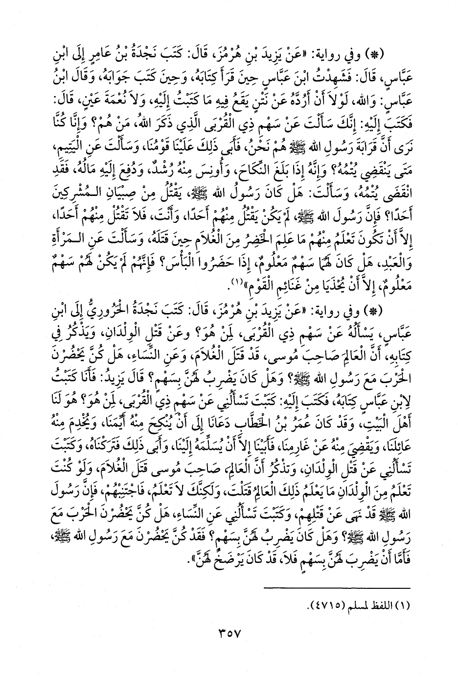 - وفي رواية: «عن يزيد بن هُرمُز، قال: كتب نجدة الحروري إلى ابن عباس، يسأله عن سهم ذي القربى، لمن هو؟ وعن قتل الولدان، ويذكر في كتابه، أن العالم صاحب موسى، قد قتل الغلام، وعن النساء، هل كن يحضرن الحرب مع رسول الله صَلى الله عَليه وسَلم؟ وهل كان يضرب لهن بسهم؟ قال يزيد: فأنا كتبت لابن عباس كتابه، فكتب إليه: كتبت تسألني عن سهم ذي القربى، لمن هو؟ هو لنا أهل البيت، وقد كان عمر بن الخطاب دعانا إلى أن ينكح منه أيمنا، ويخدم منه عائلنا، ويقضي منه عن غارمنا، فأبينا إلا أن يسلمه إلينا، وأبى ذلك فتركناه، وكتبت تسألني عن قتل الولدان، وتذكر أن العالم، صاحب موسى قتل الغلام، ولو كنت تعلم من الولدان ما يعلم ذلك العالم قتلت، ولكنك لا تعلم، فاجتنبهم، فإن رسول الله صَلى الله عَليه وسَلم قد نهى عن قتلهم، وكتبت تسألني عن النساء، هل كن يحضرن الحرب مع رسول الله صَلى الله عَليه وسَلم؟ وهل كان يضرب لهن بسهم؟ فقد كن يحضرن مع رسول الله صَلى الله عَليه وسَلم فأما أن يضرب لهن بسهم فلا، قد كان يرضخ لهن».