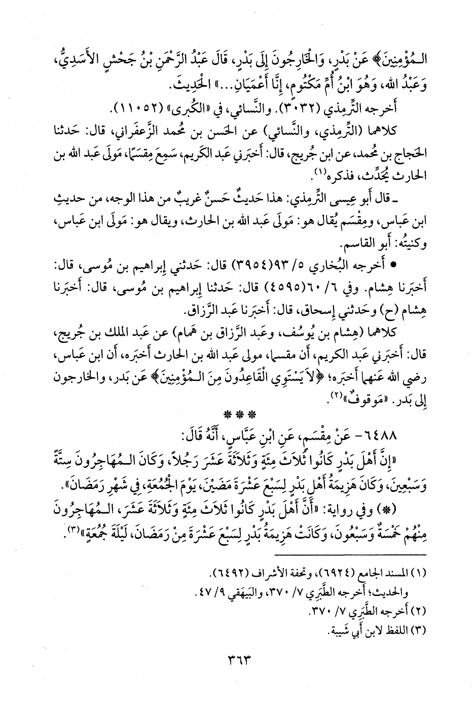 كلاهما (هشام بن يوسف، وعبد الرزاق بن همام) عن عبد الملك بن جُريج، قال: أخبرني عبد الكريم، أن مقسما مولى عبد الله بن الحارث أخبره، أن ابن عباس، رضي الله عنهما أخبره؛ {لا يستوي القاعدون من المؤمنين} عن بدر، والخارجون إلى بدر. «موقوف» (¬٢).