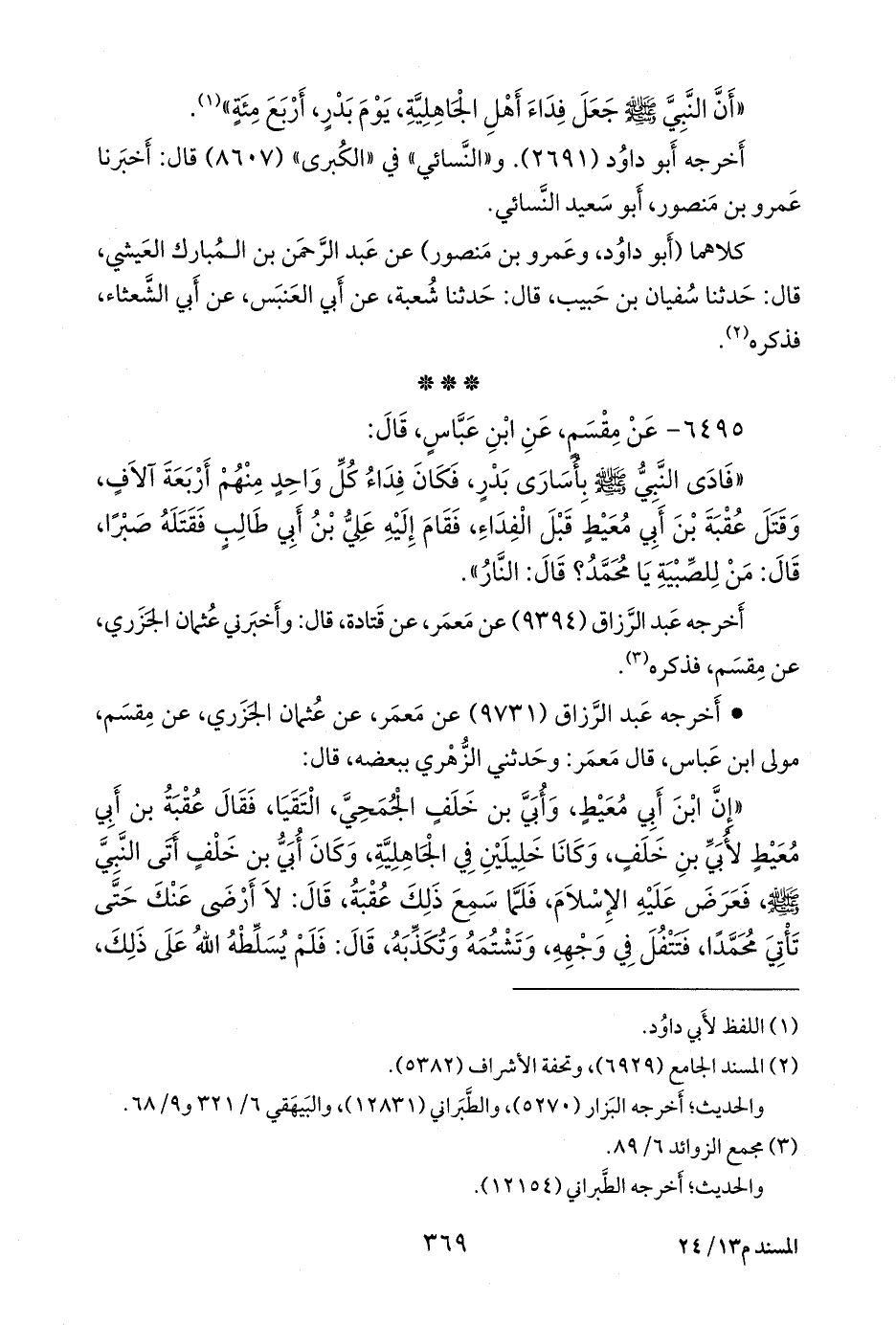 «فادى النبي صَلى الله عَليه وسَلم بأسارى بدر، فكان فداء كل واحد منهم أربعة آلاف، وقتل عقبة بن أبي معيط قبل الفداء، فقام إليه علي بن أبي طالب فقتله صبرا، قال: من للصبية يا محمد؟ قال: النار».
