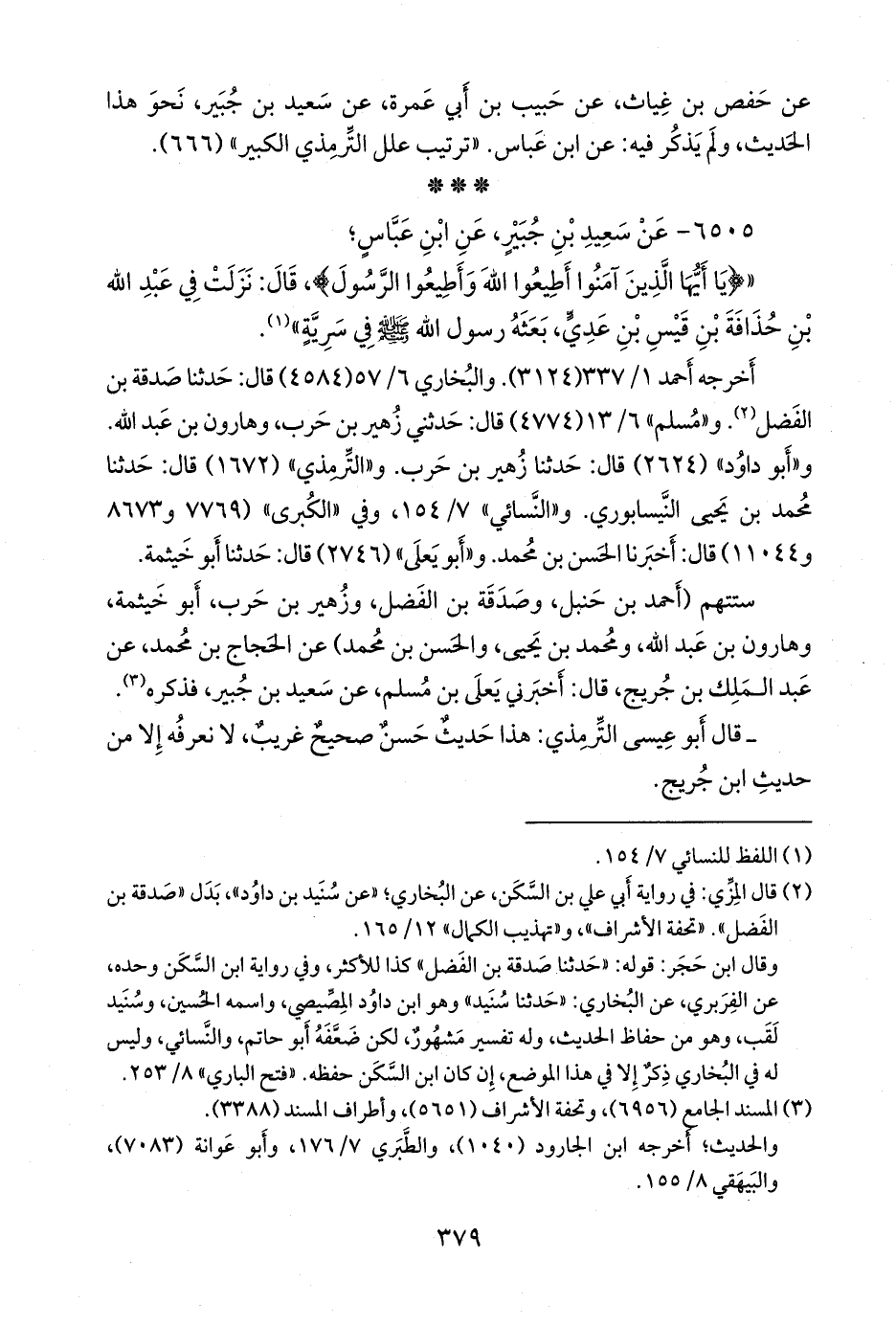 ستتهم (أحمد بن حنبل، وصدقة بن الفضل، وزهير بن حرب، أَبو خيثمة، وهارون بن عبد الله، ومحمد بن يحيى، والحسن بن محمد) عن الحجاج بن محمد، عن عبد الملك بن جُريج، قال: أخبرني يَعلى بن مسلم، عن سعيد بن جبير، فذكره (¬٣).