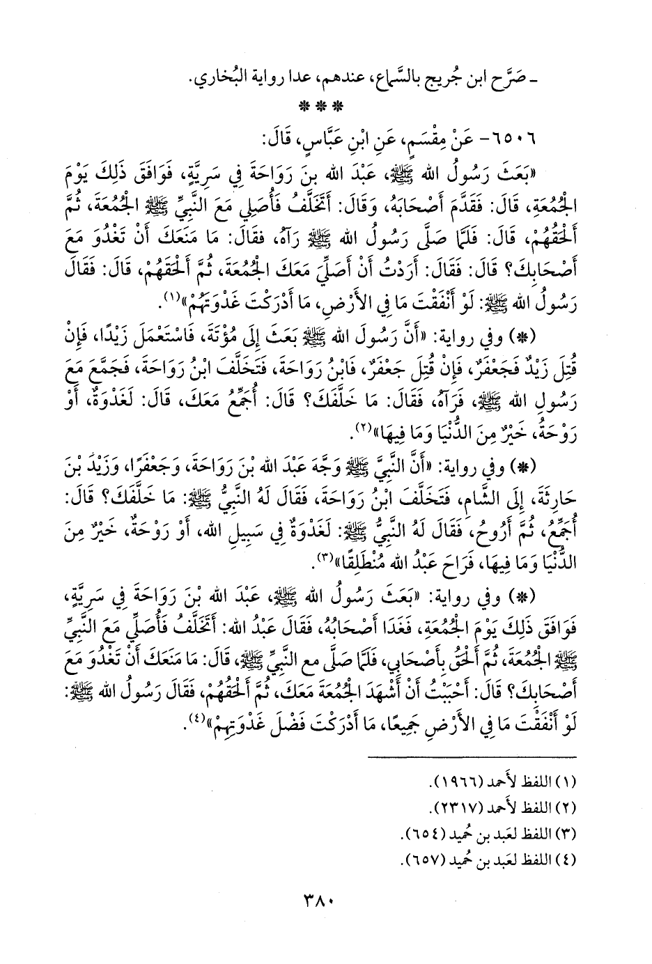 - وفي رواية: «بعث رسول الله صَلى الله عَليه وسَلم عبد الله بن رَوَاحة في سرية، فوافق ذلك يوم الجمعة، فغدا أصحابه، فقال عبد الله: أتخلف فأصلي مع النبي صَلى الله عَليه وسَلم الجمعة، ثم ألحق بأصحابي، فلما صلى مع النبي صَلى الله عَليه وسَلم قال: ما منعك أن تغدو مع أصحابك؟ قال: أحببت أن أشهد الجمعة معك، ثم ألحقهم، فقال رسول الله صَلى الله عَليه وسَلم: لو أنفقت ما في الأرض جميعا، ما أدركت فضل غدوتهم» (¬٤).