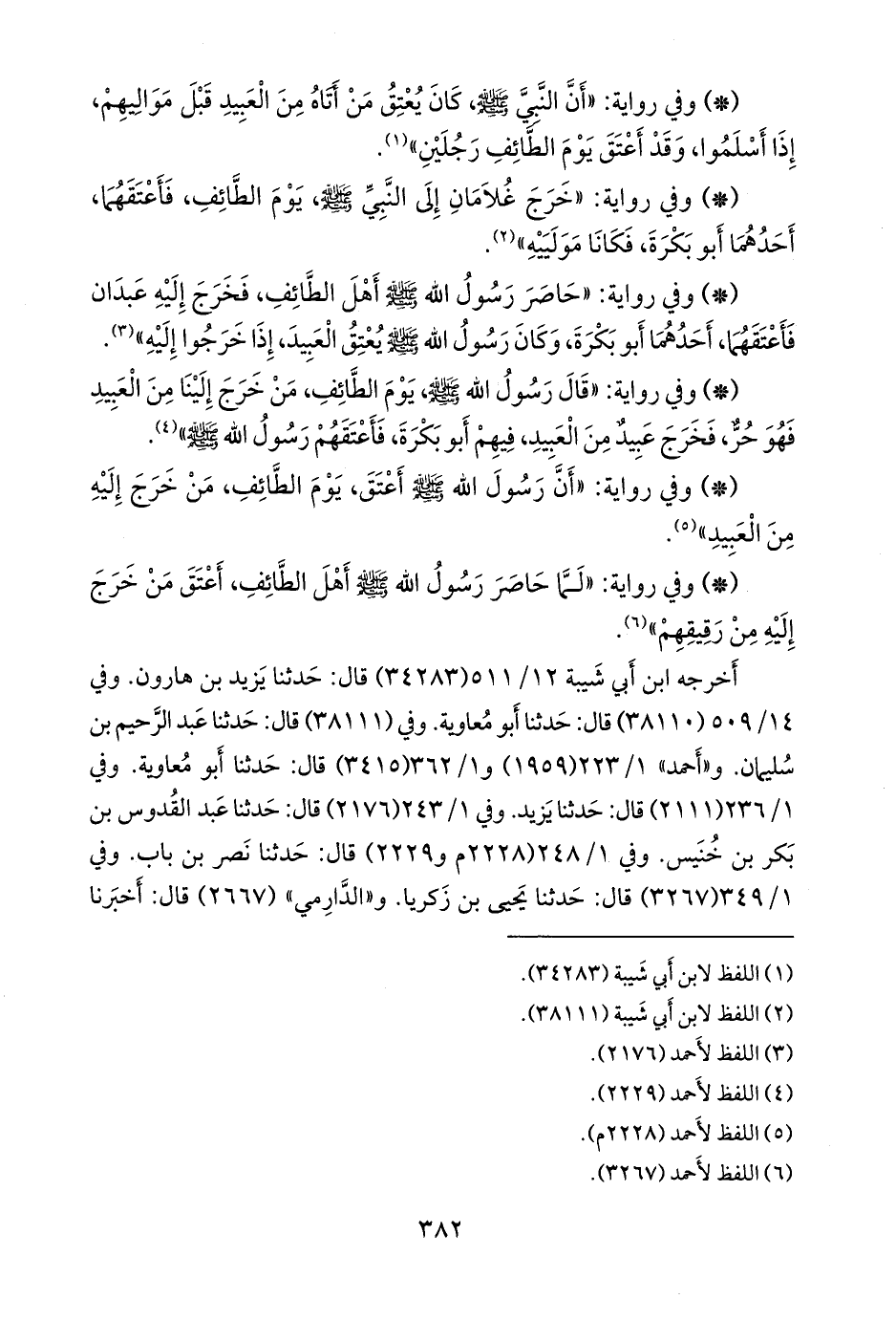 - وفي رواية: «أن رسول الله صَلى الله عَليه وسَلم أعتق، يوم الطائف، من خرج إليه من العبيد» (¬١).