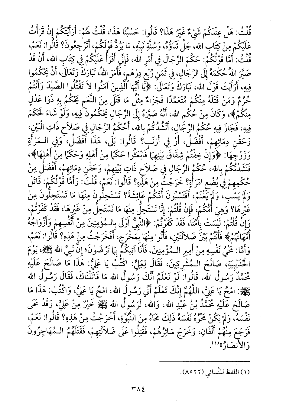فجاز فيه حكم الرجال، أنشدكم بالله، أحكم الرجال في صلاح ذات البين، وحقن دمائهم، أفضل، أو في أرنب؟ قالوا: بلى، هذا أفضل، وفي المرأة وزوجها: {وإن خفتم شقاق بينهما فابعثوا حكما من أهله وحكما من أهلها}، فنشدتكم بالله، حكم الرجال في صلاح ذات بينهم، وحقن دمائهم، أفضل من حكمهم في بضع امرأة؟ خرجت من هذه؟ قالوا: نعم، قلت: وأما قولكم: قاتل ولم يسب، ولم يغنم، أفتسبون أمكم عائشة؟ تستحلون منها ما تستحلون من غيرها؟ وهي أمكم، فإن قلتم: إنا نستحل منها ما نستحل من غيرها، فقد كفرتم، وإن قلتم: ليست بأمنا، فقد كفرتم: {النبي أولى بالمؤمنين من أنفسهم وأزواجه أمهاتهم} فأنتم بين ضلالتين، فأتوا منها بمخرج، أفخرجت من هذه؟ قالوا: نعم، وأما: محي نفسه من أمير المؤمنين، فأنا آتيكم بما ترضون؛ إن نبي الله صَلى الله عَليه وسَلم يوم الحُدَيبيَة، صالح المشركين، فقال لعلي: اكتب يا علي: هذا ما صالح عليه محمد رسول الله، قالوا: لو نعلم أنك رسول الله ما قاتلناك، فقال رسول الله صَلى الله عَليه وسَلم: امح يا علي، اللهم إنك تعلم أني رسول الله، امح يا علي، واكتب: هذا ما صالح عليه محمد بن عبد الله، والله، لرسول الله صَلى الله عَليه وسَلم خير من علي، وقد محى نفسه، ولم يكن محوه نفسه ذلك محاه من النبوة، أخرجت من هذه؟ قالوا: نعم، فرجع منهم ألفان، وخرج سائرهم، فقتلوا على ضلالتهم، فقتلهم المهاجرون والأنصار» (¬١).