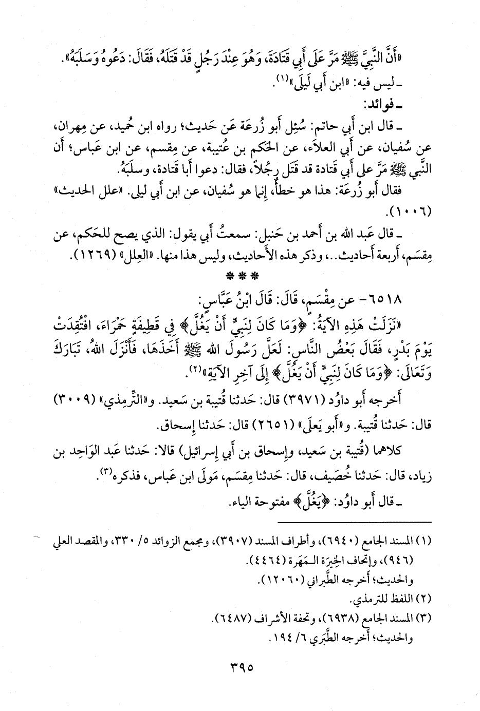 - قلنا: إِسناده ضعيفٌ؛ قال ابن أبي حاتم: سئل أَبو زُرعَة عن حديث؛ رواه ابن حميد، عن مِهران، عن سفيان، عن أبي العلاء، عن الحكم بن عتيبة، عن مِقسَم، عن ابن عباس؛ أن النبي صَلى الله عَليه وسَلم مر على أبي قتادة قد قتل رجلا، فقال: دعوا أبا قتادة، وسلبه.