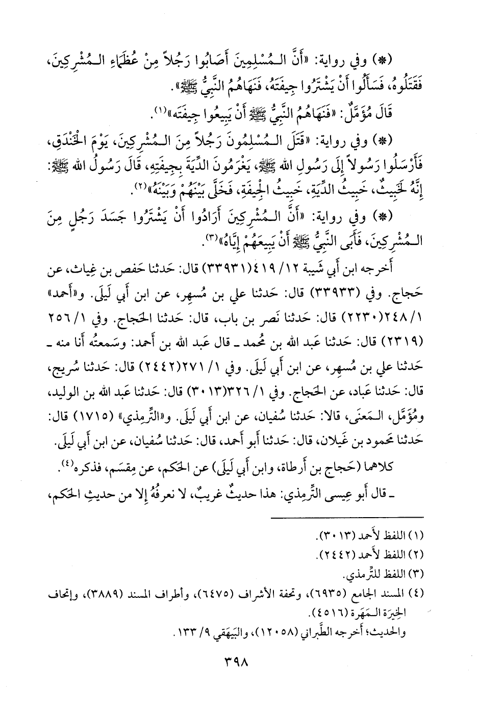«أن رجلا من المشركين أصيب، يوم الخندق، فأعطوا النبي صَلى الله عَليه وسَلم بجيفته، حتى بلغوا الدية، فأبى». «مُرسَل».