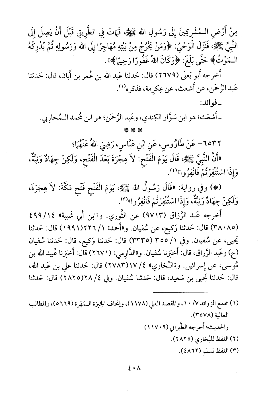 - وفي رواية: «قال رسول الله صَلى الله عَليه وسَلم يوم الفتح فتح مكة: لا هجرة، ولكن جهاد ونية، وإذا استنفرتم فانفروا» (¬٢).