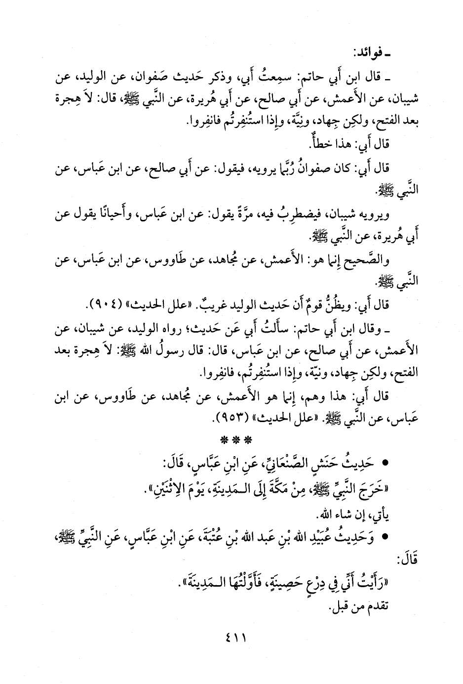 - قال عبد الرَّحمَن بن أبي حاتم الرازي: سمعت أبي، وذكر حديث صفوان، عن الوليد، عن شَيبان، عن الأعمش، عن أبي صالح، عن أبي هريرة، عن النبي صَلى الله عَليه وسَلم قال: لا هجرة بعد الفتح، ولكن جهاد، ونية، وإذا استنفرتم فانفروا.