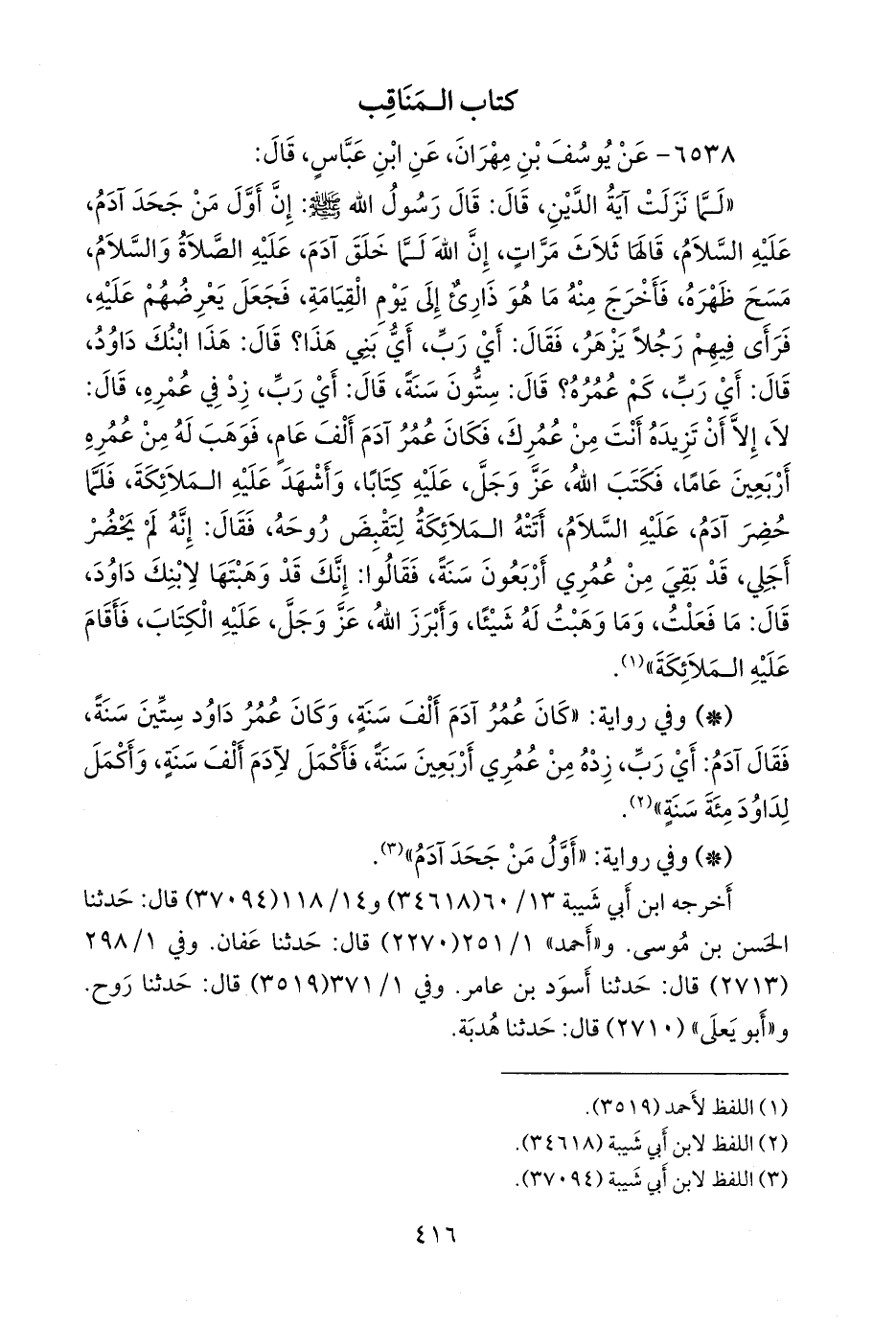 - وفي رواية: «كان عمر آدم ألف سنة، وكان عمر داود ستين سنة، فقال آدم: أي رب، زده من عمري أربعين سنة، فأكمل لآدم ألف سنة، وأكمل لداود مئة سنة» (¬٣).