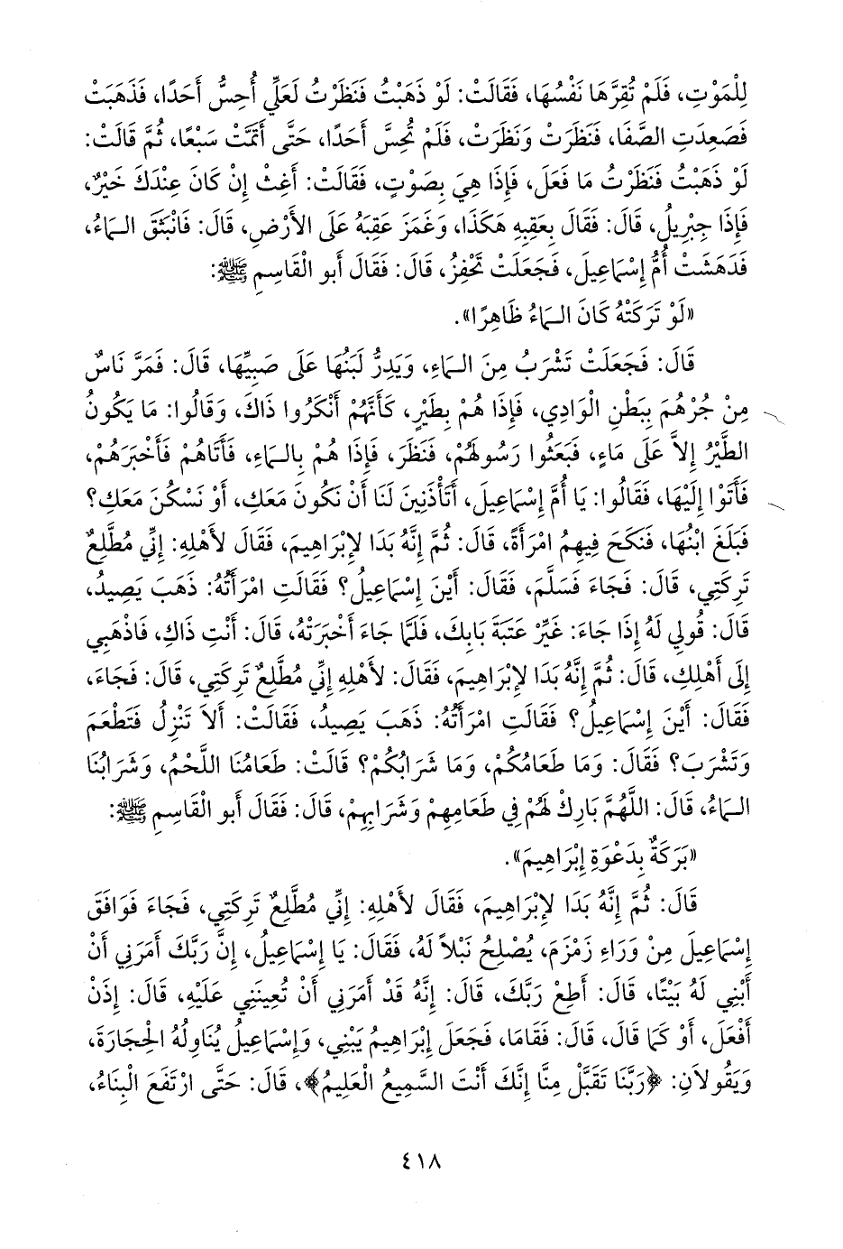 قال: فجعلت تشرب من الماء، ويدر لبنها على صبيها، قال: فمر ناس من جرهم ببطن الوادي، فإذا هم بطير، كأنهم أنكروا ذاك، وقالوا: ما يكون الطير إلا على ماء، فبعثوا رسولهم، فنظر، فإذا هم بالماء، فأتاهم فأخبرهم، فأتوا إليها، فقالوا: يا أُم إسماعيل، أتأذنين لنا أن نكون معك، أو نسكن معك؟ فبلغ ابنها، فنكح فيهم امرأة، قال: ثم إنه بدا لإبراهيم، فقال لأهله: إني مطلع تركتي، قال: فجاء فسلم، فقال: أين إسماعيل؟ فقالت امرأته: ذهب يصيد، قال: قولي له إذا جاء: غير عتبة بابك، فلما جاء أخبرته، قال: أنت ذاك، فاذهبي إلى أهلك، قال: ثم إنه بدا لإبراهيم، فقال لأهله: إني مطلع تركتي، قال: فجاء، فقال: أين إسماعيل؟ فقالت امرأته: ذهب يصيد، فقالت: ألا تنزل فتطعم وتشرب؟ فقال: وما طعامكم، وما شرابكم؟ قالت: طعامنا اللحم، وشرابنا الماء، قال: اللهم بارك لهم في طعامهم وشرابهم، قال: فقال أَبو القاسم صَلى الله عَليه وسَلم: