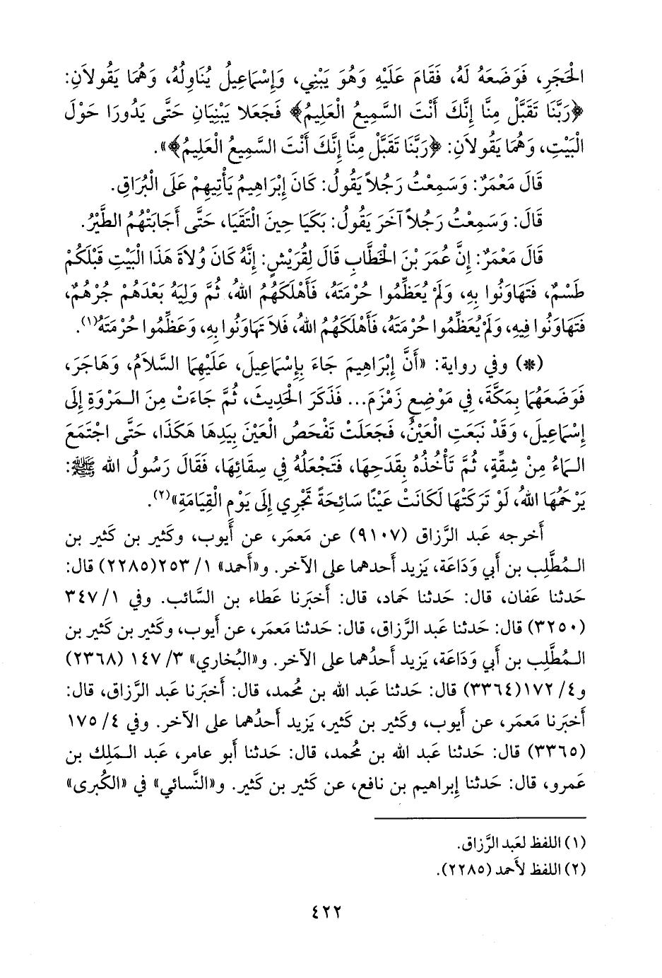 بإسماعيل وأمه، عليهم السلام، وهي ترضعه، معها شنة ـ لم يرفعه ـ ثم جاء بها إبراهيم، وبابنها إسماعيل. «موقوف» (¬٣).