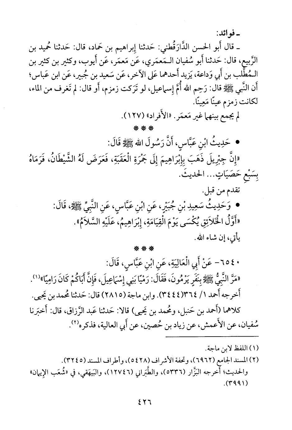 - قال أَبو الحسن الدارقُطني: حدثنا إبراهيم بن حماد، قال: حدثنا حميد بن الربيع، قال: حدثنا أَبو سفيان المعمري، عن مَعمَر، عن أيوب، وكثير بن كثير بن المطلب بن أبي وداعة، يزيد أحدهما على الآخر، عن سعيد بن جبير، عن ابن عباس؛ أن النبي صَلى الله عَليه وسَلم قال: رحم الله أم إسماعيل، لو تركت زمزم، أو قال: لم تغرف من الماء، لكانت زمزم عينا معينا.