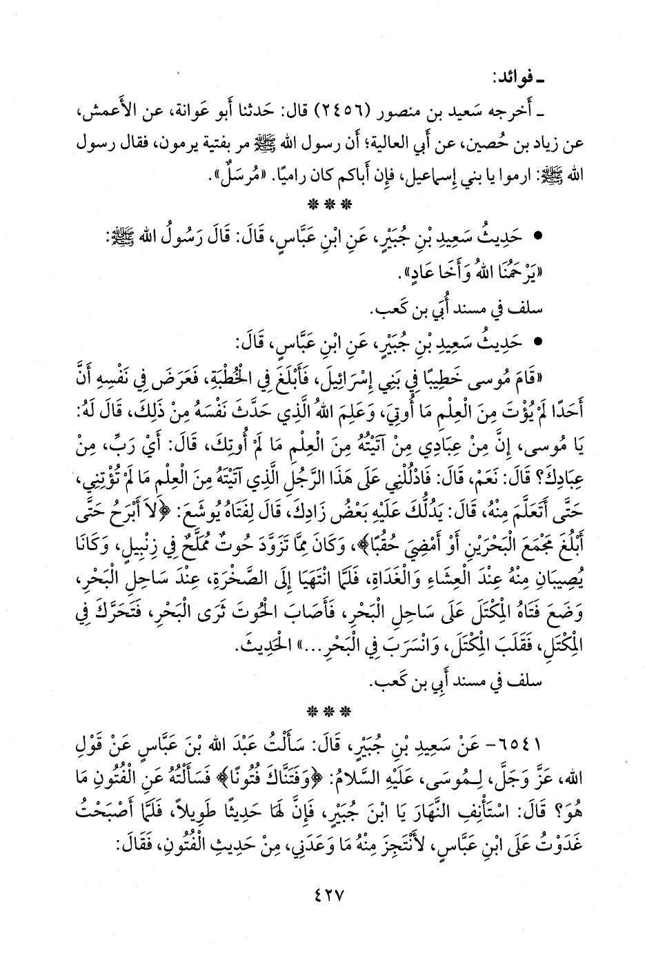 ٦٥٤١ - عن سعيد بن جبير، قال: سألت عبد الله بن عباس عن قول الله، عز وجل، لموسى، عليه السلام: {وفتناك فتونا} فسألته عن الفتون ما هو؟ قال: استأنف النهار يا ابن جبير، فإن لها حديثا طويلا، فلما أصبحت غدوت على ابن عباس، لأنتجز منه ما وعدني، من حديث الفتون، فقال: