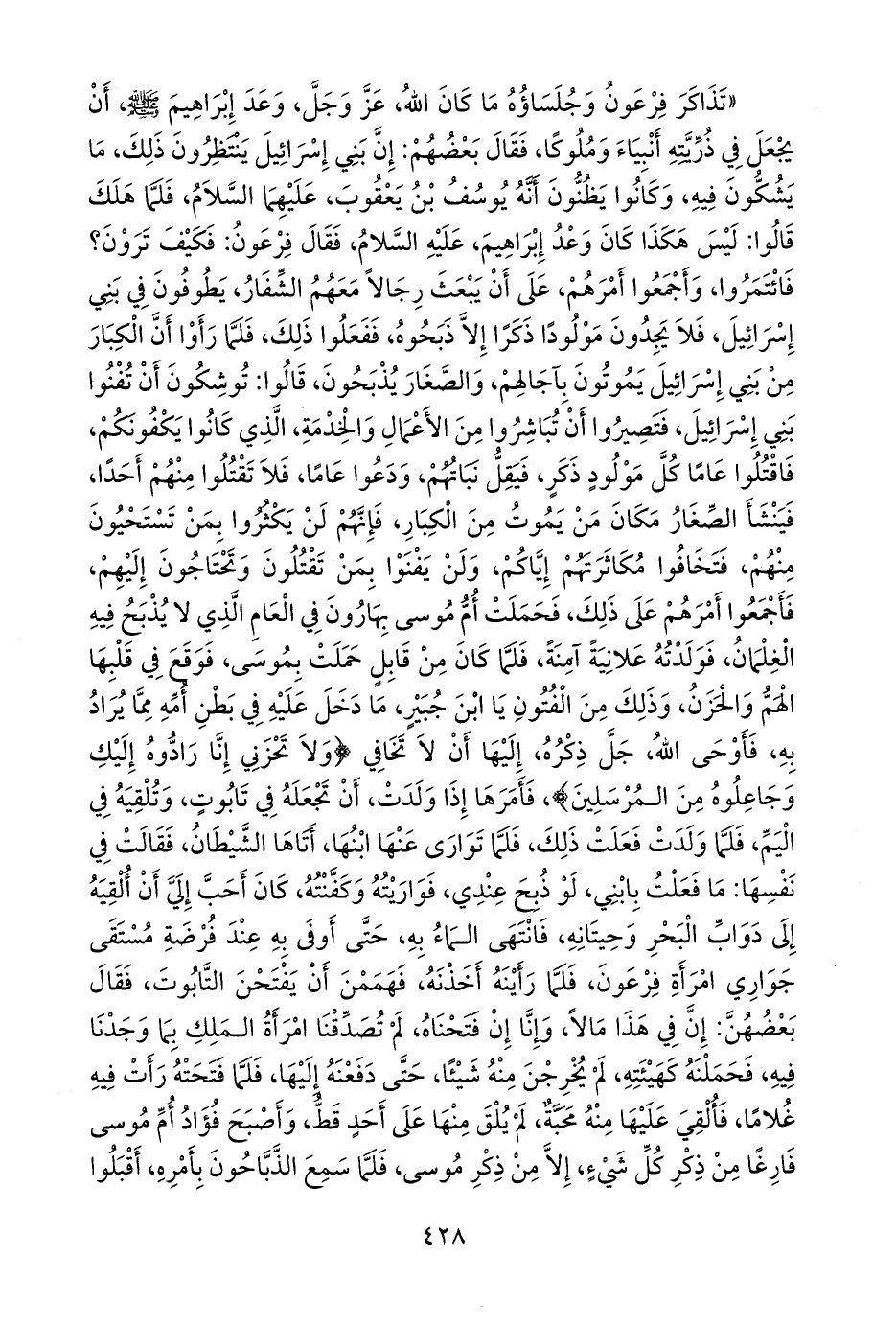 فأمرها إذا ولدت، أن تجعله في تابوت، وتلقيه في اليم، فلما ولدت فعلت ذلك، فلما توارى عنها ابنها، أتاها الشيطان، فقالت في نفسها: ما فعلت بابني، لو ذبح عندي، فواريته وكفنته، كان أحب إلي أن ألقيه إلى دواب البحر وحيتانه، فانتهى الماء به، حتى أوفى به عند فرضة مستقى جواري امرأة فرعون، فلما رأينه أخذنه، فهممن أن يفتحن التابوت، فقال بعضهن: إن في هذا مالا، وإنا إن فتحناه، لم تصدقنا امرأة الملك بما وجدنا فيه، فحملنه كهيئته، لم يخرجن منه شيئا، حتى دفعنه إليها، فلما فتحته رأت فيه غلاما، فألقي عليها منه محبة، لم يلق منها على أحد قط، وأصبح فؤاد أُم موسى فارغا من ذكر كل شيء، إلا من ذكر موسى، فلما سمع الذباحون بأمره، أقبلوا