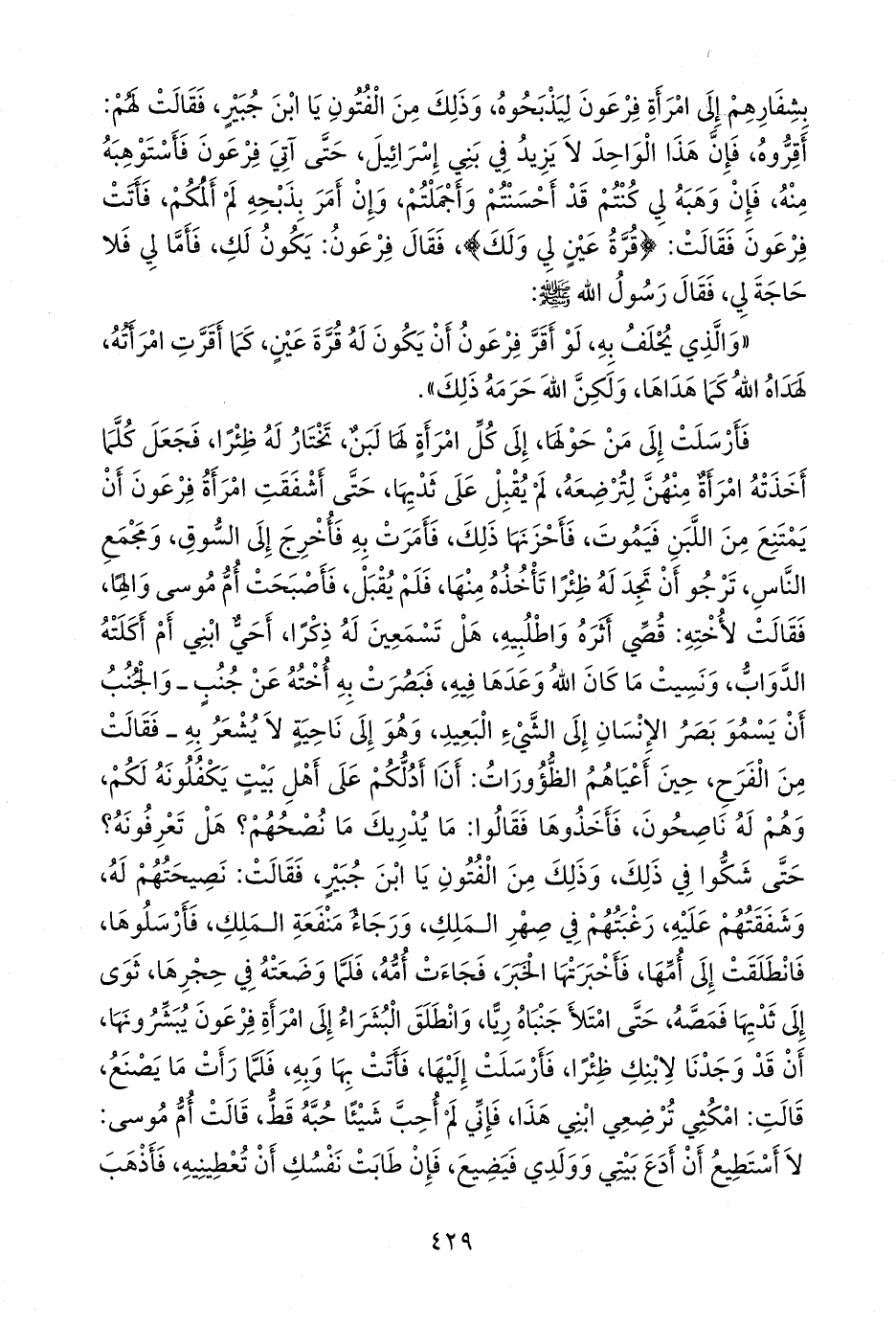 فأرسلت إلى من حولها، إلى كل امرأة لها لبن، تختار له ظئرا، فجعل كلما أخذته امرأة منهن لترضعه، لم يقبل على ثديها، حتى أشفقت امرأة فرعون أن يمتنع من اللبن فيموت، فأحزنها ذلك، فأمرت به فأخرج إلى السوق، ومجمع الناس، ترجو أن تجد له ظئرا تأخذه منها، فلم يقبل، فأصبحت أُم موسى والها، فقالت لأخته: قصي أثره واطلبيه، هل تسمعين له ذكرا، أحي ابني أم أكلته الدواب، ونسيت ما كان الله وعدها فيه، فبصرت به أخته عن جنب، والجنب أن يسمو بصر الإنسان إلى الشيء البعيد، وهو إلى ناحية لا يشعر به ـ فقالت من الفرح، حين أعياهم الظؤورات: أنا أدلكم على أهل بيت يكفلونه لكم، وهم له ناصحون، فأخذوها فقالوا: ما يدريك ما نصحهم؟ هل تعرفونه؟ حتى شكوا في ذلك، وذلك من الفتون يا ابن جبير، فقالت: نصيحتهم له، وشفقتهم عليه، رغبتهم في صهر الملك، ورجاء منفعة الملك، فأرسلوها، فانطلقت إلى أمها، فأخبرتها الخبر، فجاءت أمه، فلما وضعته في حجرها، ثوى إلى ثديها فمصه، حتى امتلأ جنباه ريا، وانطلق البشراء إلى امرأة فرعون يبشرونها، أن قد وجدنا لابنك ظئرا، فأرسلت إليها، فأتت بها وبه، فلما رأت ما يصنع، قالت: امكثي ترضعي ابني هذا، فإني لم أحب شيئًا حبه قط، قالت أُم موسى: لا أستطيع أن أدع بيتي وولدي فيضيع، فإن طابت نفسك أن تعطينيه، فأذهب