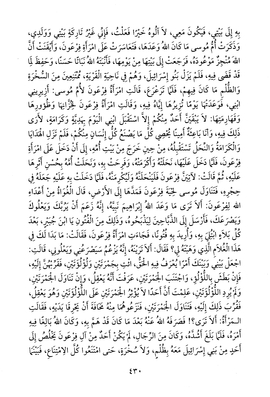 وقالت امرأة فرعون لخزانها وظؤورها وقهارمتها: لا يبقين أحد منكم إلا استقبل ابني اليوم بهدية وكرامة، لأرى ذلك فيه، وأنا باعثة أمينا يحصي كل ما يصنع كل إنسان منكم، فلم تزل الهدايا والكرامة والنحل تستقبله، من حين خرج من بيت أمه، إلى أن دخل على امرأة فرعون، فلما دخل عليها، نحلته وأكرمته، وفرحت به، ونحلت أمه بحسن أثرها عليه، ثم قالت: لآتين فرعون فلينحلنه وليكرمنه، فلما دخلت به عليه جعله في حجره، فتناول موسى لحية فرعون فمدها إلى الأرض، قال الغواة من أعداء الله لفرعون: ألا ترى ما وعد الله إبراهيم نبيه، إنه زعم أن يربك ويعلوك ويصرعك، فأرسل إلى الذباحين ليذبحوه، وذلك من الفتون يا ابن جبير، بعد كل بلاء ابتلي به، وأريد به فتونا، فجاءت امرأة فرعون، فقالت: ما بدا لك في هذا الغلام الذي وهبته لي؟ فقال: ألا ترينه، إنه يزعم سيصرعني ويعلوني، قالت: اجعل بيني وبينك أمرا يعرف فيه الحق، ائت بجمرتين ولؤلؤتين، فقربهن إليه، فإن بطش باللؤلؤ، واجتنب الجمرتين، عرفت أنه يعقل، وإن تناول الجمرتين، ولم يرد اللؤلؤتين، علمت أن أحدا لا يؤثر الجمرتين على اللؤلؤتين وهو يعقل، فقرب ذلك إليه، فتناول الجمرتين، فنزعوهما منه مخافة أن يحرقا يديه، فقالت المرأة: ألا ترى؟! فصرفه الله عنه بعد ما كان قد هم به، وكان الله بالغا فيه أمره، فلما بلغ أشده، وكان من الرجال، لم يكن أحد من آل فرعون يخلص إلى أحد من بني إسرائيل معه بظلم، ولا سخرة، حتى امتنعوا كل الامتناع، فبينما