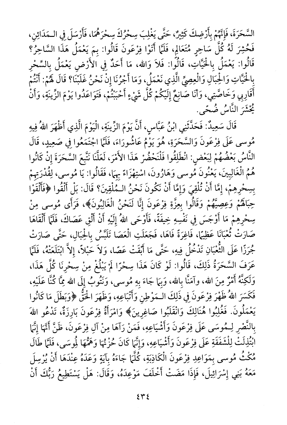 قال سعيد: فحدثني ابن عباس، أن يوم الزينة، اليوم الذي أظهر الله فيه موسى على فرعون والسحرة، هو يوم عاشوراء، فلما اجتمعوا في صعيد، قال الناس بعضهم لبعض: انطلقوا فلنحضر هذا الأمر، لعلنا نتبع السحرة إن كانوا هم الغالبين، يعنون موسى وهارون، استهزاء بهما، فقالوا: يا موسى، لقدرتهم بسحرهم، إما أن تلقي وإما أن نكون نحن الملقين؟ قال: بل ألقوا {فألقوا حبالهم وعصيهم وقالوا بعزة فرعون إنا لنحن الغالبون}، فرأى موسى من سحرهم ما أوجس في نفسه خيفة، فأوحى الله إليه أن ألق عصاك، فلما ألقاها صارت ثعبانا عظيما، فاغرة فاها، فجعلت العصا تلبس بالحبال، حتى صارت جرزا على الثعبان تدخل فيه، حتى ما أبقت عصا، ولا حبلا، إلا ابتلعته، فلما عرف السحرة ذلك، قالوا: لو كان هذا سحرا لم يبلغ من سحرنا كل هذا، ولكنه أمر من الله، وآمنا بالله، وبما جاء به موسى، ونتوب إلى الله مما كنا عليه، فكسر الله ظهر فرعون في ذلك الموطن وأتباعه، وظهر الحق {وبطل ما كانوا يعملون. فغلبوا هنالك وانقلبوا صاغرين} وامرأة فرعون بارزة، تدعو الله بالنصر لموسى على فرعون وأشياعه، فمن رآها من آل فرعون، ظن أنها إنما ابتذلت للشفقة على فرعون وأشياعه، وإنما كان حزنها وهمها لموسى، فلما طال مكث موسى بمواعد فرعون الكاذبة، كلما جاءه بآية وعده عندها أن يرسل معه بني إسرائيل، فإذا مضت أخلف موعده، وقال: هل يستطيع ربك أن