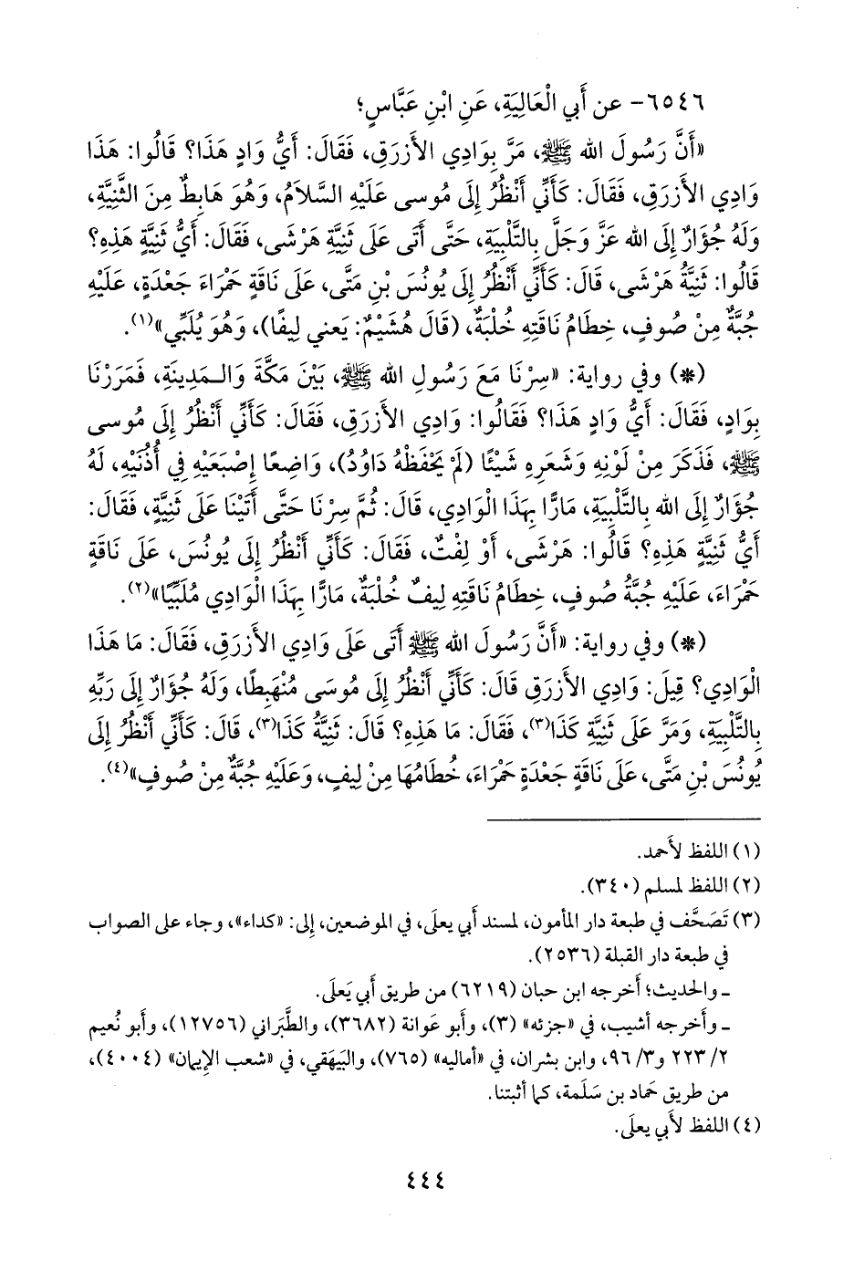 - وفي رواية: «سرنا مع رسول الله صَلى الله عَليه وسَلم بين مكة والمدينة، فمررنا بواد، فقال: أي واد هذا؟ فقالوا: وادي الأزرق، فقال: كأني أنظر إلى موسى صَلى الله عَليه وسَلم فذكر من لونه وشعره شيئًا (لم يحفظه داود)، واضعا إصبعيه في أذنيه، له جؤار إلى الله بالتلبية، مارا بهذا الوادي، قال: ثم سرنا حتى أتينا على ثنية، فقال: أي ثنية هذه؟ قالوا: هرشى، أو لفت، فقال: كأني أنظر إلى يونس، على ناقة حمراء، عليه جبة صوف، خطام ناقته ليف خلبة، مارا بهذا الوادي ملبيا» (¬٢).