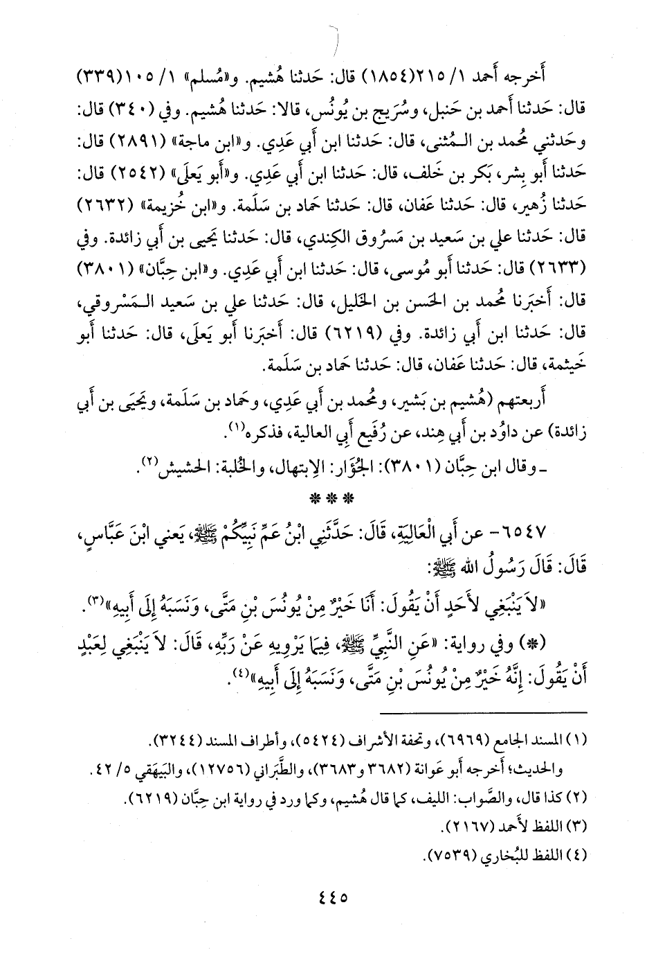 أخرجه أحمد (١٨٥٤) قال: حدثنا هُشيم. و «مسلم» ١/ ١٠٥ (٣٣٩) قال: حدثنا أحمد بن حنبل، وسريج بن يونس، قالا: حدثنا هُشيم. وفي (٣٤٠) قال: وحدثني محمد بن المثنى، قال: حدثنا ابن أَبي عَدي. و «ابن ماجة» (٢٨٩١) قال: حدثنا أَبو بشر، بكر بن خلف، قال: حدثنا ابن أَبي عَدي. و «أَبو يَعلى» (٢٥٤٢) قال: حدثنا زهير، قال: حدثنا عفان، قال: حدثنا حماد بن سلمة. و «ابن خزيمة» (٢٦٣٢) قال: حدثنا علي بن سعيد بن مسروق الكندي، قال: حدثنا يحيى بن أبي زائدة. وفي (٢٦٣٣) قال: حدثنا أَبو موسى، قال: حدثنا ابن أَبي عَدي. و «ابن حِبَّان» (٣٨٠١) قال: أخبرنا محمد بن الحسن بن الخليل، قال: حدثنا علي بن سعيد المسروقي، قال: حدثنا ابن أبي زائدة. وفي (٦٢١٩) قال: أخبرنا أَبو يَعلى، قال: حدثنا أَبو خيثمة، قال: حدثنا عفان، قال: حدثنا حماد بن سلمة.