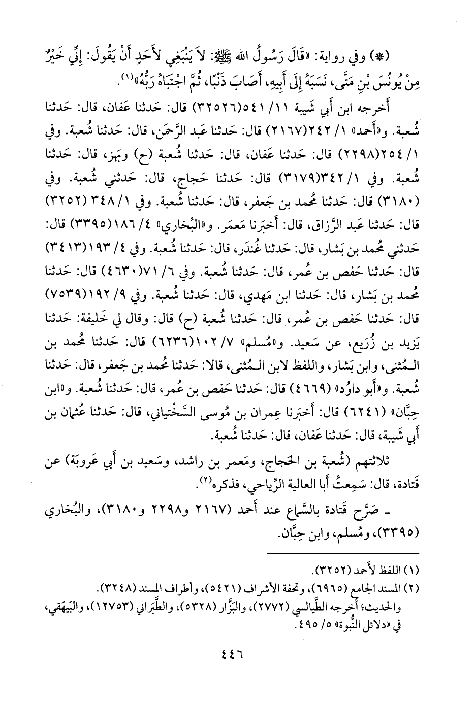 وفي ١/ ٣٤٨ (٣٢٥٢) قال: حدثنا عبد الرزاق، قال: أخبرنا مَعمَر. و «البخاري» ٤/ ١٥٣ (٣٣٩٥) قال: حدثني محمد بن بشار، قال: حدثنا غُندَر، قال: حدثنا شعبة. وفي ٤/ ١٥٩ (٣٤١٣) قال: حدثنا حفص بن عمر، قال: حدثنا شعبة. وفي ٦/ ٥٧ (٤٦٣٠) قال: حدثنا محمد بن بشار، قال: حدثنا ابن مهدي، قال: حدثنا شعبة. وفي ٩/ ١٥٧ (٧٥٣٩) قال: حدثنا حفص بن عمر، قال: حدثنا شعبة (ح) قال: وقال لي خليفة: حدثنا يزيد بن زُريع، عن سعيد. و «مسلم» ٧/ ١٠٢ (٦٢٣٦) قال: حدثنا محمد بن المثنى، وابن بشار، واللفظ لابن المثنى، قالا: حدثنا محمد بن جعفر، قال: حدثنا شعبة. و «أَبو داود» (٤٦٦٩) قال: حدثنا حفص بن عمر، قال: حدثنا شعبة. و «ابن حِبَّان» (٦٢٤١) قال: أخبرنا عمران بن موسى السَّخْتِياني، قال: حدثنا عثمان بن أبي شيبة، قال: حدثنا عفان، قال: حدثنا شعبة.