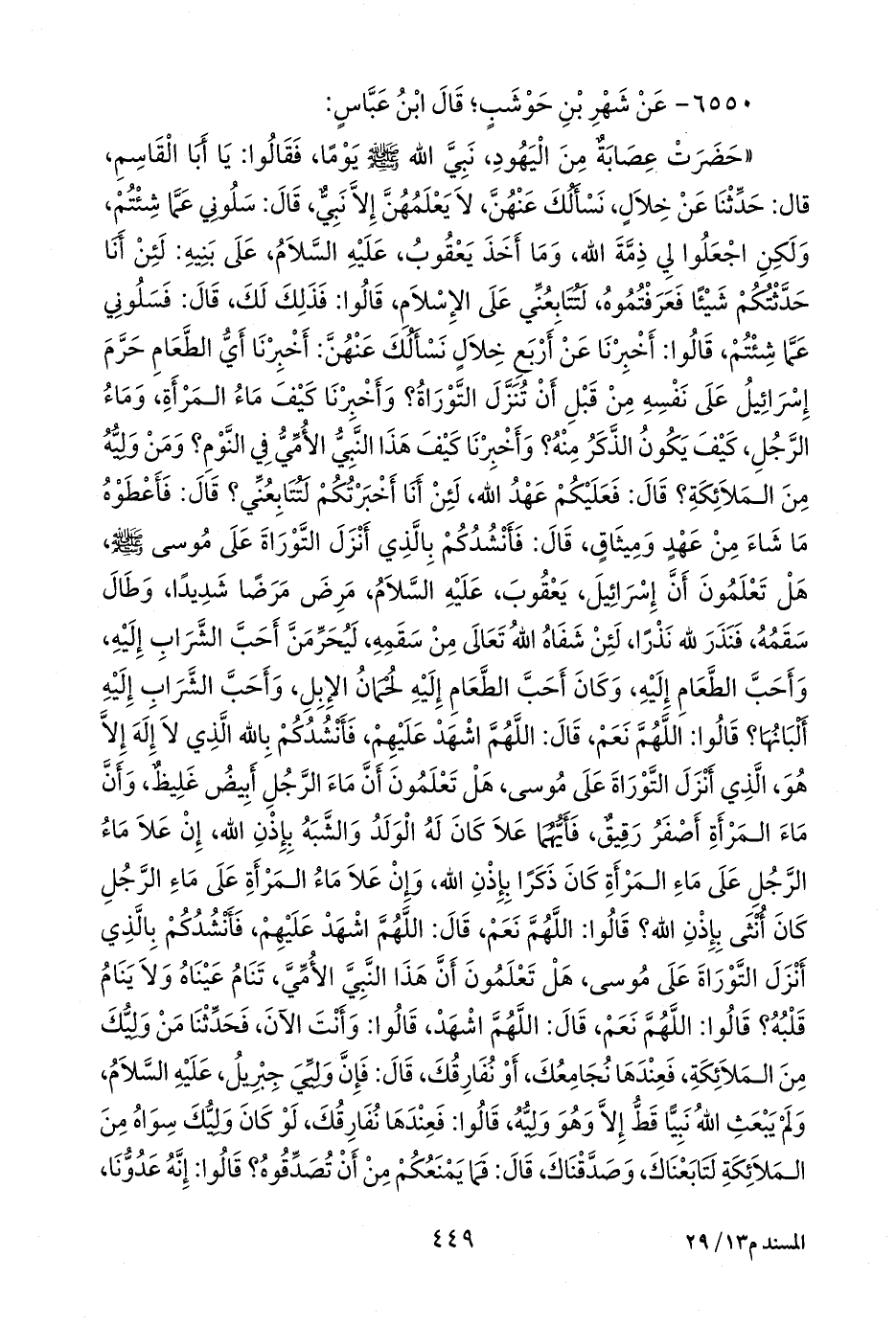 «حضرت عصابة من اليهود، نبي الله صَلى الله عَليه وسَلم يوما، فقالوا: يا أبا القاسم، حدثنا عن خلال، نسألك عنهن، لا يعلمهن إلا نبي، قال: سلوني عما شئتم، ولكن اجعلوا لي ذمة الله، وما أخذ يعقوب، عليه السلام، على بنيه: لئن أنا حدثتكم شيئًا فعرفتموه، لتتابعني على الإسلام، قالوا: فذلك لك، قال: فسلوني عما شئتم، قالوا: أخبرنا عن أربع خلال نسألك عنهن: أخبرنا أي الطعام حرم إسرائيل على نفسه من قبل أن تنزل التوراة؟ وأخبرنا كيف ماء المرأة، وماء الرجل، كيف يكون الذكر منه؟ وأخبرنا كيف هذا النبي الأمي في النوم؟ ومن وليه من الملائكة؟ قال: فعليكم عهد الله، لئن أنا أخبرتكم لتتابعني؟ قال: فأعطوه ما شاء من عهد وميثاق، قال: فأنشدكم بالذي أنزل التوراة على موسى صَلى الله عَليه وسَلم هل تعلمون أن إسرائيل، يعقوب، عليه السلام، مرض مرضا شديدا، وطال سقمه، فنذر لله نذرا، لئن شفاه الله تعالى من سقمه، ليحرمن أحب الشراب إليه، وأحب الطعام إليه، وكان أحب الطعام إليه لحمان الإبل، وأحب الشراب إليه ألبانها؟ قالوا: اللهم نعم، قال: اللهم اشهد عليهم، فأنشدكم بالله الذي لا إله إلا هو، الذي أنزل التوراة على موسى، هل تعلمون أن ماء الرجل أبيض غليظ، وأن ماء المرأة أصفر رقيق، فأيهما علا كان له الولد والشبه بإذن الله، إن علا ماء الرجل على ماء المرأة كان ذكرا بإذن الله، وإن علا ماء المرأة على ماء الرجل كان أنثى بإذن الله؟ قالوا: اللهم نعم، قال: اللهم اشهد عليهم، فأنشدكم بالذي أنزل التوراة على موسى، هل تعلمون أن هذا النبي الأمي، تنام عيناه ولا ينام قلبه؟ قالوا: اللهم نعم،