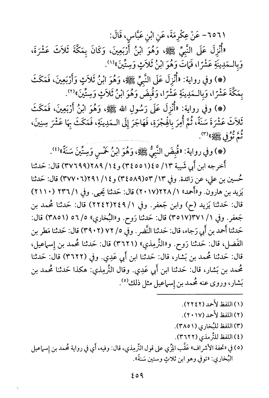 - وفي رواية: «أنزل على رسول الله صَلى الله عَليه وسَلم وهو ابن أربعين، فمكث ثلاث عشرة سنة، ثم أمر بالهجرة، فهاجر إلى المدينة، فمكث بها عشر سنين، ثم توفي صَلى الله عَليه وسَلم» (¬٣).