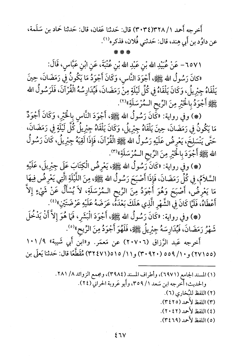 - وفي رواية: «كان رسول الله صَلى الله عَليه وسَلم أجود الناس بالخير، وكان أجود ما يكون في رمضان، حين يلقاه جبريل، وكان يلقاه جبريل كل ليلة في رمضان، حتى ينسلخ، يعرض عليه رسول الله صَلى الله عَليه وسَلم القرآن، فإذا لقيه جبريل، كان رسول الله صَلى الله عَليه وسَلم أجود بالخير من الريح المرسلة» (¬٢).