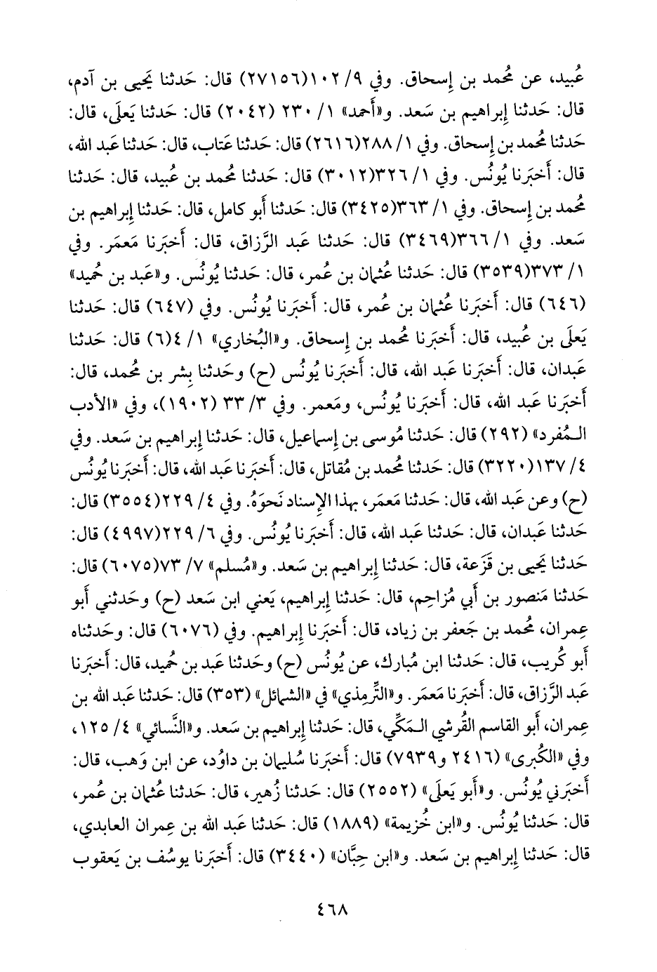 وفي ١/ ٣٦٣ (٣٤٢٥) قال: حدثنا أَبو كامل، قال: حدثنا إبراهيم بن سعد. وفي ١/ ٣٦٦ (٣٤٦٩) قال: حدثنا عبد الرزاق، قال: أخبرنا مَعمَر. وفي ١/ ٣٧٣ (٣٥٣٩) قال: حدثنا عثمان بن عمر، قال: حدثنا يونس. و «عَبد بن حُميد» (٦٤٦) قال: أخبرنا عثمان بن عمر، قال: أخبرنا يونس. وفي (٦٤٧) قال: حدثنا يَعلى بن عبيد، قال: أخبرنا محمد بن إسحاق. و «البخاري» ١/ ٨ (٦) قال: حدثنا عبدان، قال: أخبرنا عبد الله، قال: أخبرنا يونس (ح) وحدثنا بشر بن محمد، قال: أخبرنا عبد الله، قال: أخبرنا يونس، ومعمر. وفي ٣/ ٢٦ (١٩٠٢)، وفي «الأدب المفرد» (٢٩٢) قال: حدثنا موسى بن إسماعيل، قال: حدثنا إبراهيم بن سعد. وفي ٤/ ١١٣ (٣٢٢٠) قال: حدثنا محمد بن مقاتل، قال: أخبرنا عبد الله، قال: أخبرنا يونس (ح) وعن عبد الله، قال: حدثنا معمر، بهذا الإسناد نحوه. وفي ٤/ ١٨٨ (٣٥٥٤) قال: حدثنا عبدان، قال: حدثنا عبد الله، قال: أخبرنا يونس. وفي ٦/ ١٨٦ (٤٩٩٧) قال: حدثنا يحيى بن قَزَعة، قال: حدثنا إبراهيم بن سعد. و «مسلم» ٧/ ٧٣ (٦٠٧٥) قال: حدثنا منصور بن أبي مزاحم، قال: حدثنا إبراهيم، يعني ابن سعد (ح) وحدثني أَبو عمران، محمد بن جعفر بن زياد، قال: أخبرنا إبراهيم. وفي (٦٠٧٦) قال: وحدثناه أَبو كُريب، قال: حدثنا ابن مبارك، عن يونس (ح) وحدثنا عَبد بن حُميد، قال: أخبرنا عبد الرزاق، قال: أخبرنا مَعمَر. و «التِّرمِذي» في «الشمائل» (٣٥٣) قال: حدثنا عبد الله بن عمران، أَبو القاسم القرشي المكي، قال: حدثنا إبراهيم بن سعد. و «النَّسَائي» ٤/ ١٢٥، وفي «الكبرى» (٢٤١٦ و ٧٩٣٩) قال: أخبرنا سليمان بن داود، عن ابن وهب، قال: أخبرني يونس. و «أَبو يَعلى» (٢٥٥٢) قال: حدثنا زهير، قال: حدثنا عثمان بن عمر، قال: حدثنا يونس. و «ابن خزيمة» (١٨٨٩) قال: حدثنا عبد الله بن عمران العابدي، قال: حدثنا إبراهيم بن سعد. و «ابن حِبَّان» (٣٤٤٠) قال: أخبرنا يوسف بن يعقوب