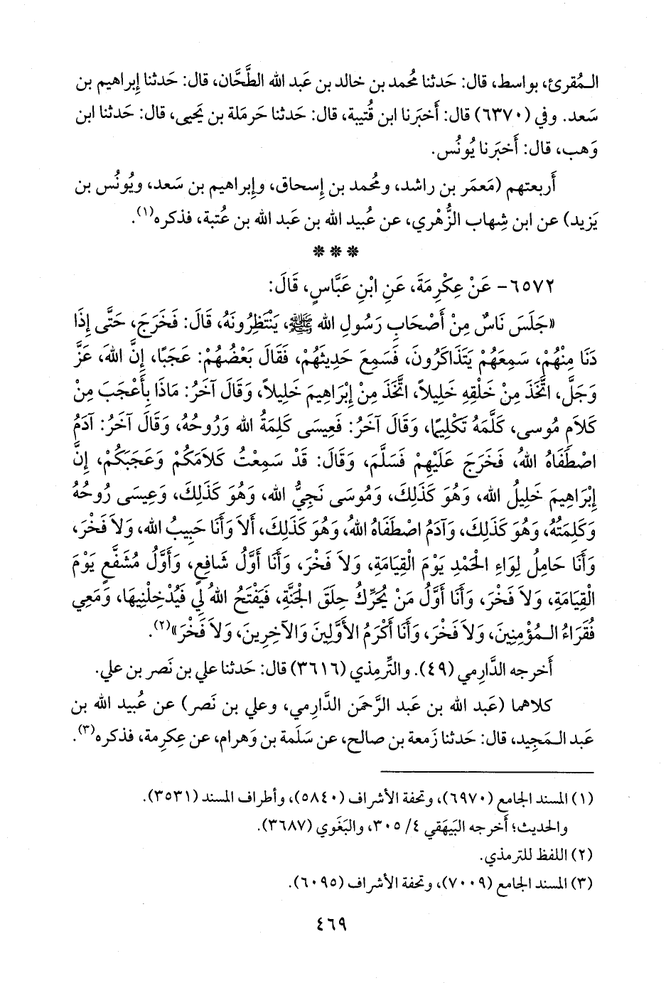 «جلس ناس من أصحاب رسول الله صَلى الله عَليه وسَلم ينتظرونه، قال: فخرج، حتى إذا دنا منهم، سمعهم يتذاكرون، فسمع حديثهم، فقال بعضهم: عجبا، إن الله، عز وجل، اتخذ من خلقه خليلا، اتخذ من إبراهيم خليلا، وقال آخر: ماذا بأعجب من كلام موسى، كلمه تكليما، وقال آخر: فعيسى كلمة الله وروحه، وقال آخر: آدم اصطفاه الله، فخرج عليهم فسلم، وقال: قد سمعت كلامكم وعجبكم، إن إبراهيم خليل الله، وهو كذلك، وموسى نجي الله، وهو كذلك، وعيسى روحه وكلمته، وهو كذلك، وآدم اصطفاه الله، وهو كذلك، ألا وأنا حبيب الله، ولا فخر، وأنا حامل لواء الحمد يوم القيامة، ولا فخر، وأنا أول شافع، وأول مشفع يوم القيامة، ولا فخر، وأنا أول من يحرك حلق الجنة، فيفتح الله لي فيدخلنيها، ومعي فقراء المؤمنين، ولا فخر، وأنا أكرم الأولين والآخرين، ولا فخر» (¬١).