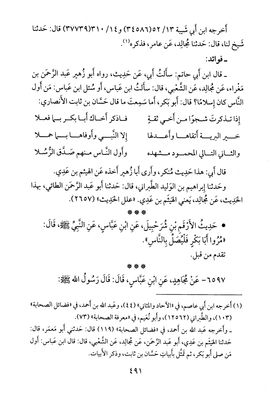 - وقال ابن أبي حاتم: سألت أبي، عن حديث، رواه أَبو زهير عبد الرَّحمَن بن مغراء، عن مجالد، عن الشعبي، قال: سألت ابن عباس، أو سئل ابن عباس: من أول الناس كان إسلاما؟ قال: أَبو بكر، أما سمعت ما قال حسان بن ثابت الأَنصاري: