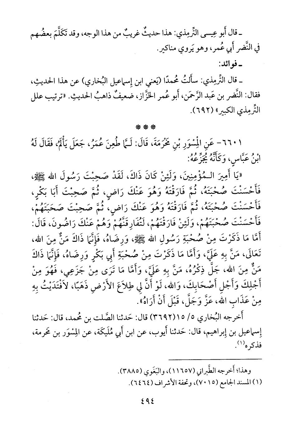 ٦٦٠١ - عن المسور بن مخرمة، قال: لما طعن عمر، جعل يألم، فقال له ابن عباس، وكأنه يجزعه: