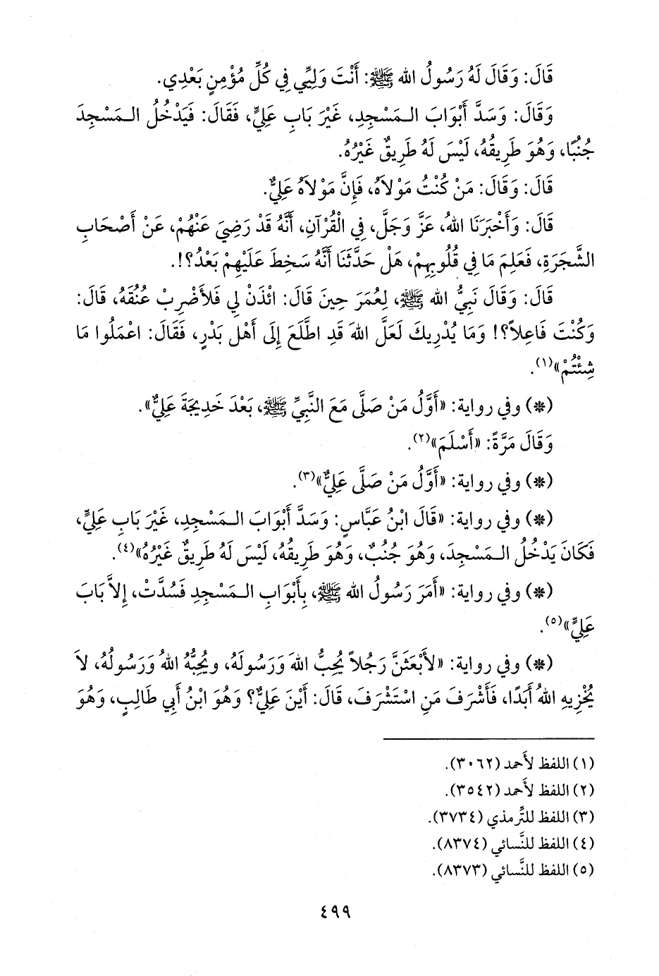 - وفي رواية: «أمر رسول الله صَلى الله عَليه وسَلم بأَبواب المسجد فسدت، إلا باب علي» (¬٥).