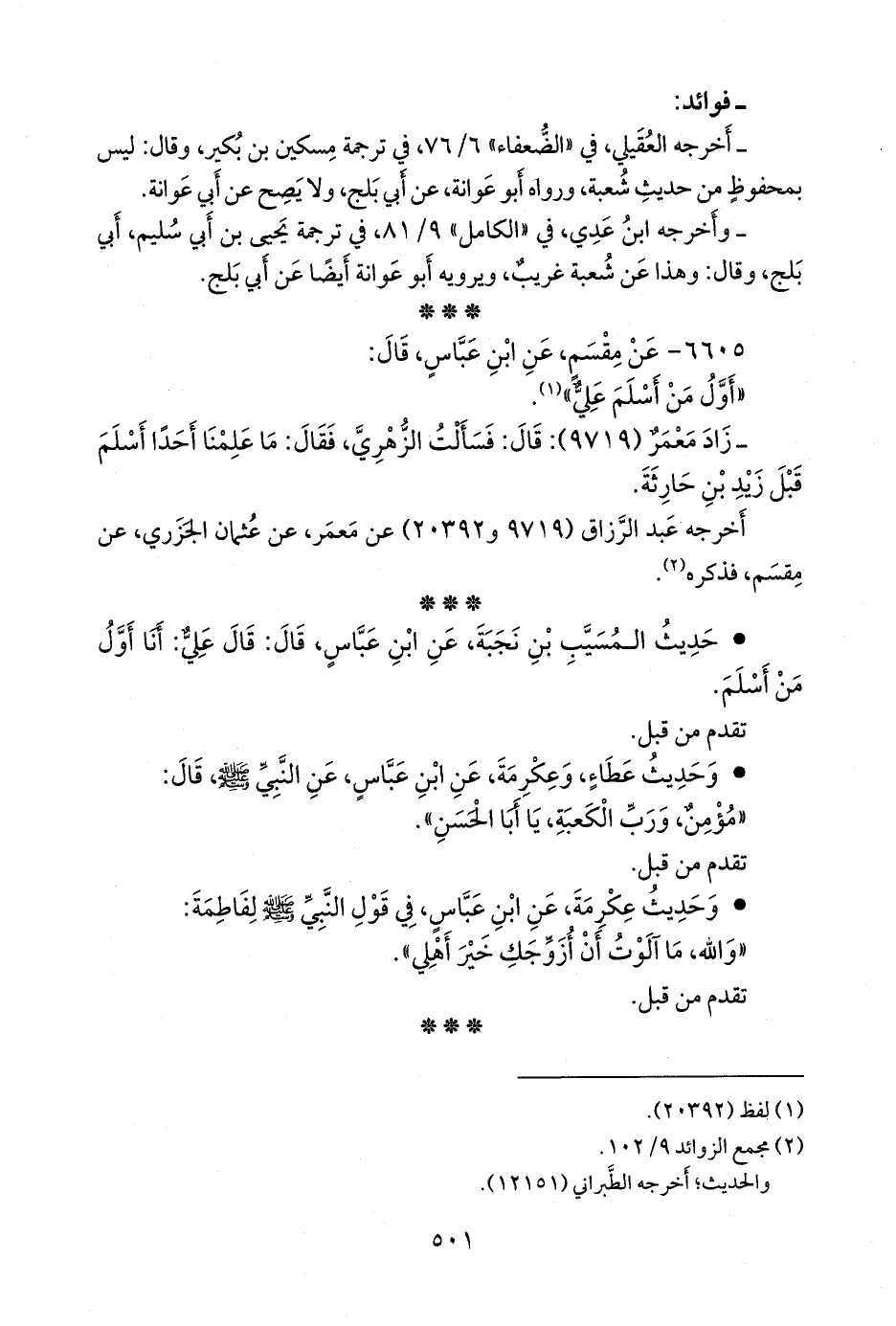 • حديث المُسَيَّب بن نَجَبَة، عن ابن عباس، قال: قال علي: أنا أول من أسلم.