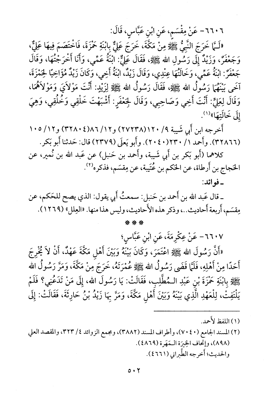 كلاهما (أَبو بكر بن أبي شيبة، وأحمد بن حنبل) عن عبد الله بن نُمير، عن الحجاج بن أَرطَاة، عن الحكم بن عتيبة، عن مِقسَم، فذكره (¬٢).