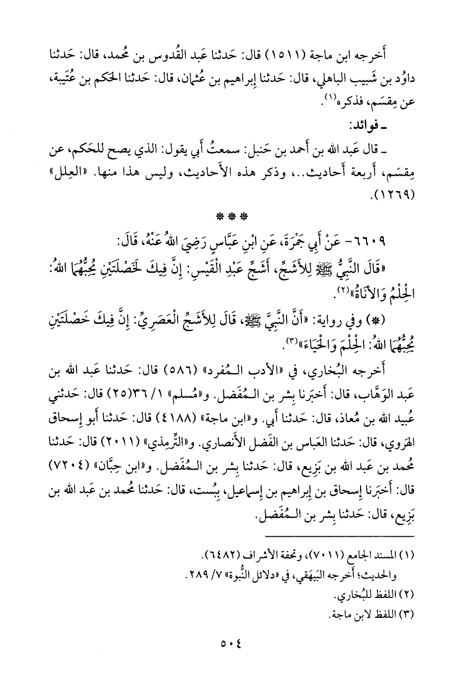 - وفي رواية: «أن النبي صَلى الله عَليه وسَلم قال للأشج العصري: إن فيك خصلتين يحبهما الله: الحلم والحياء» (¬٢).