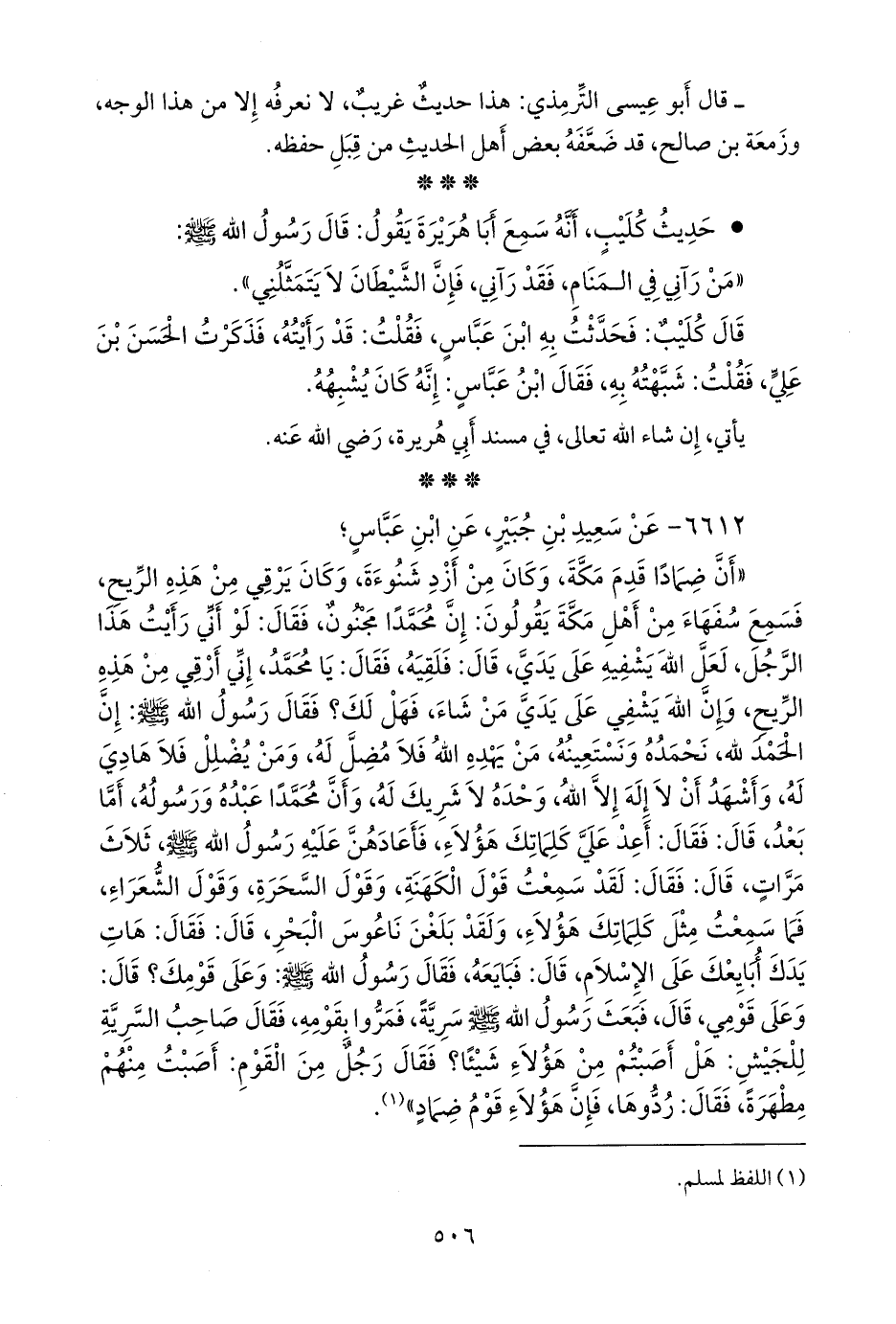 «أن ضمادا قدم مكة، وكان من أزد شنوءة، وكان يرقي من هذه الريح، فسمع سفهاء من أهل مكة يقولون: إن محمدا مجنون، فقال: لو أني رأيت هذا الرجل، لعل الله يشفيه على يدي، قال: فلقيه، فقال: يا محمد، إني أرقي من هذه الريح، وإن الله يشفي على يدي من شاء، فهل لك؟ فقال رسول الله صَلى الله عَليه وسَلم: إن الحمد لله، نحمده ونستعينه، من يهده الله فلا مضل له، ومن يضلل فلا هادي له، وأشهد أن لا إله إلا الله، وحده لا شريك له، وأن محمدا عبده ورسوله، أما بعد، قال: فقال: أعد علي كلماتك هؤلاء، فأعادهن عليه رسول الله صَلى الله عَليه وسَلم ثلاث مرات، قال: فقال: لقد سمعت قول الكهنة، وقول السحرة، وقول الشعراء، فما سمعت مثل كلماتك هؤلاء، ولقد بلغن ناعوس البحر، قال: فقال: هات يدك أبايعك على الإسلام، قال: فبايعه، فقال رسول الله صَلى الله عَليه وسَلم: وعلى قومك؟ قال: وعلى قومي، قال، فبعث رسول الله صَلى الله عَليه وسَلم سرية، فمروا بقومه، فقال صاحب السرية للجيش: هل أصبتم من هؤلاء شيئا؟ فقال رجل من القوم: أصبت منهم مطهرة، فقال: ردوها، فإن هؤلاء قوم ضماد» (¬١).