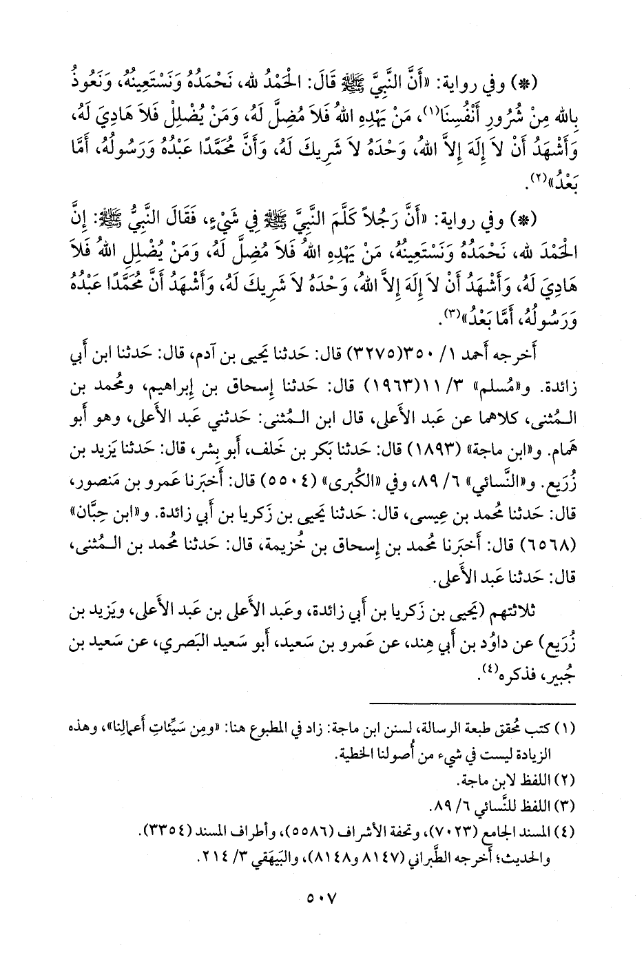 - وفي رواية: «أن النبي صَلى الله عَليه وسَلم قال: الحمد لله، نحمده ونستعينه، ونعوذ بالله من شرور أنفسنا، من يهده الله فلا مضل له، ومن يضلل فلا هادي له، وأشهد أن لا إله إلا الله، وحده لا شريك له، وأن محمدا عبده ورسوله، أما بعد» (¬١).