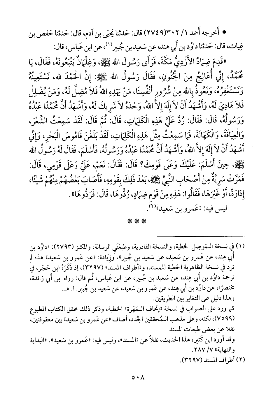 (¬١) في نسخة الموصل الخطية، والنسخة القادرية، وطبعتي الرسالة، والمكنز (٢٧٩٣): «داود بن أبي هند، عن عَمرو بن سعيد، عن سعيد بن جبير»، وزيادة: «عن عَمرو بن سعيد» هذه لم ترد في نسخة الظاهرية الخطية للمسند، و «أطراف المسند» (٣٢٩٧)، إذ ذكره ابن حجر، في ترجمة داود بن أبي هند، عن سعيد بن جبير، عن ابن عباس، ثم قال: رواه ابن أبي زائدة، مختصرا، عن داود بن أبي هند، عن عَمرو بن سعيد، عن سعيد بن جبير. ا. هـ.