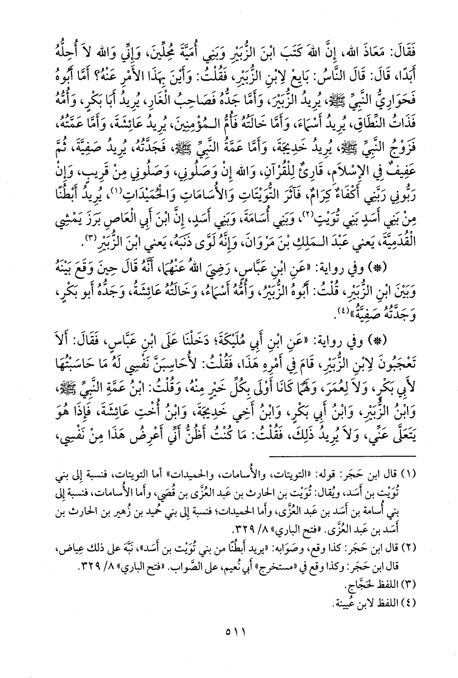 - وفي رواية: «عن ابن عباس، رضي الله عنهما، أنه قال حين وقع بينه وبين ابن الزبير، قلت: أَبوه الزبير، وأمه أسماء، وخالته عائشة، وجده أَبو بكر، وجدته صفية» (¬١).
