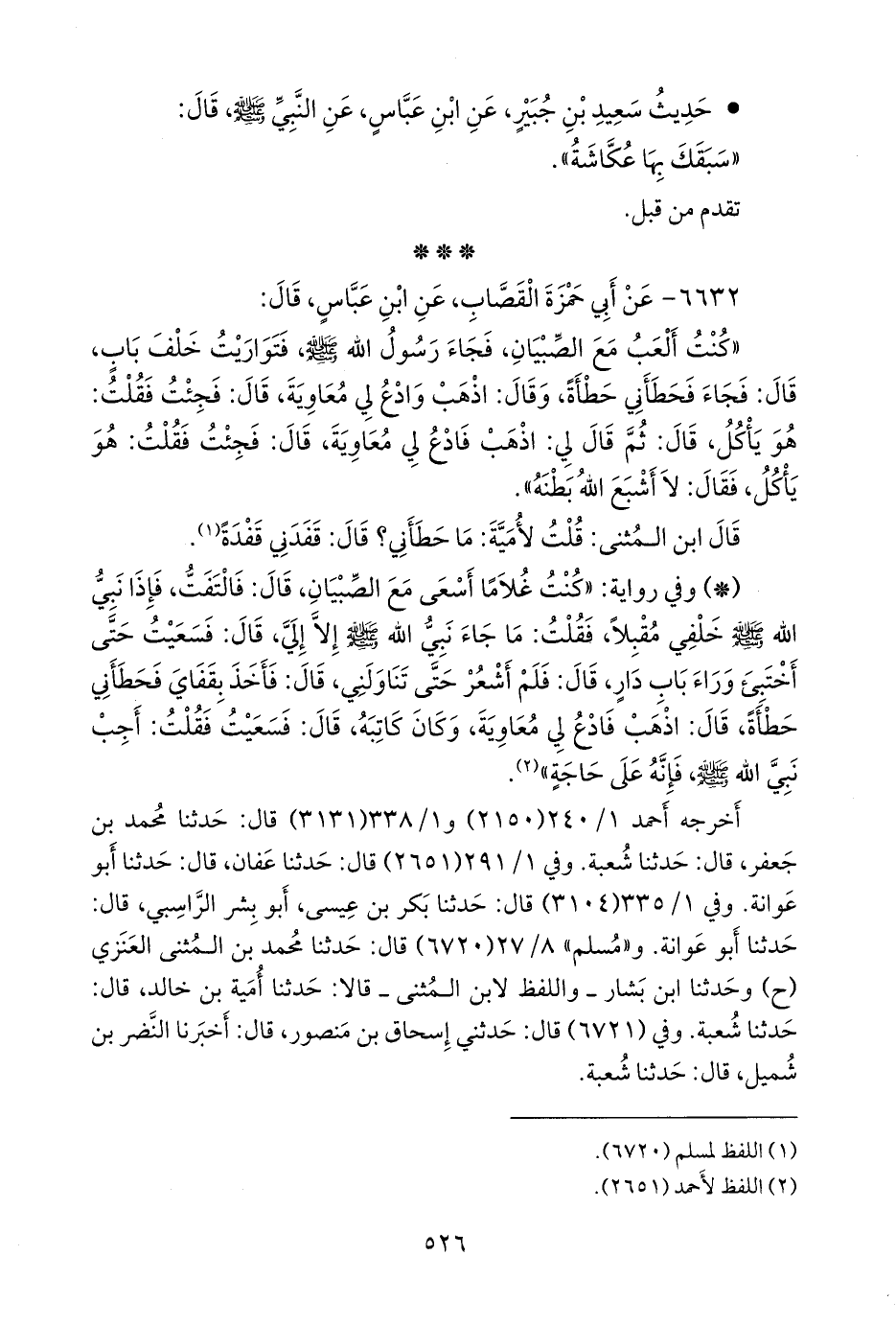 «كنت ألعب مع الصبيان، فجاء رسول الله صَلى الله عَليه وسَلم فتواريت خلف باب، قال: فجاء فحطأني حطأة، وقال: اذهب وادع لي معاوية، قال: فجئت فقلت: هو يأكل، قال: ثم قال لي: اذهب فادع لي معاوية، قال: فجئت فقلت: هو يأكل، فقال: لا أشبع الله بطنه».