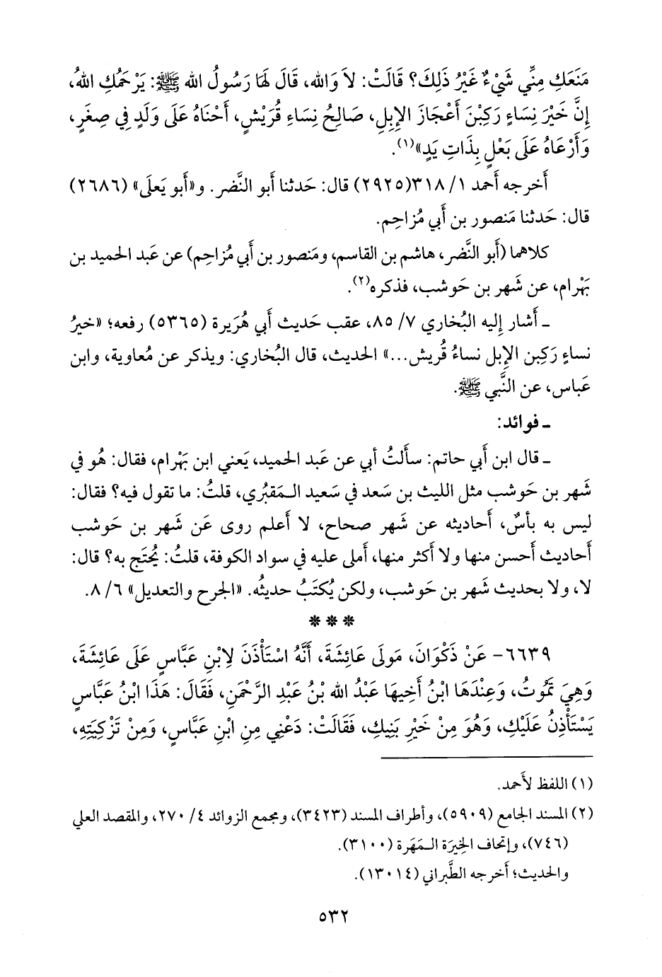 ٦٦٣٩ - عن ذكوان مولى عائشة، أنه استأذن لابن عباس على عائشة، وهي تموت، وعندها ابن أخيها عبد الله بن عبد الرَّحمَن، فقال: هذا ابن عباس يستأذن عليك، وهو من خير بنيك، فقالت: دعني من ابن عباس، ومن تزكيته،