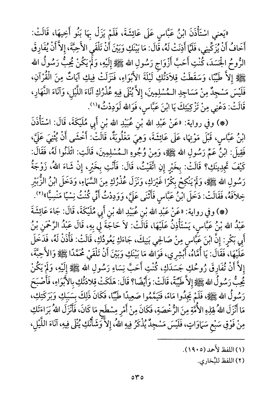 - وفي رواية: «عن عبد الله بن عُبيد الله بن أَبي مُليكة، قال: جاء عائشة عبد الله بن عباس، يستأذن عليها، قالت: لا حاجة لي به، قال عبد الرَّحمَن بن أَبي بكر: إن ابن عباس من صالحي بنيك، جاءك يعودك، قالت: فأذن له، فدخل عليها، فقال: يا أماه، أبشري، فوالله ما بينك وبين أن تلقي محمدا صَلى الله عَليه وسَلم والأحبة، إلا أن تفارق روحك جسدك، كنت أحب نساء رسول الله صَلى الله عَليه وسَلم إليه، ولم يكن يحب رسول الله صَلى الله عَليه وسَلم إلا طيبة، قالت: وأيضا؟ قال: هلكت قلادتك بالأَبواء، فأصبح رسول الله صَلى الله عَليه وسَلم فلم يجدوا ماء، فتيمموا صعيدا طيبا، فكان ذلك بسببك وبركتك، ما أنزل الله لهذه الأمة من الرخصة، فكان من أمر مسطح ما كان، فأنزل الله براءتك من فوق سبع سماوات، فليس مسجد يذكر فيه الله، إلا وشأنك يتلى فيه، آناء الليل،