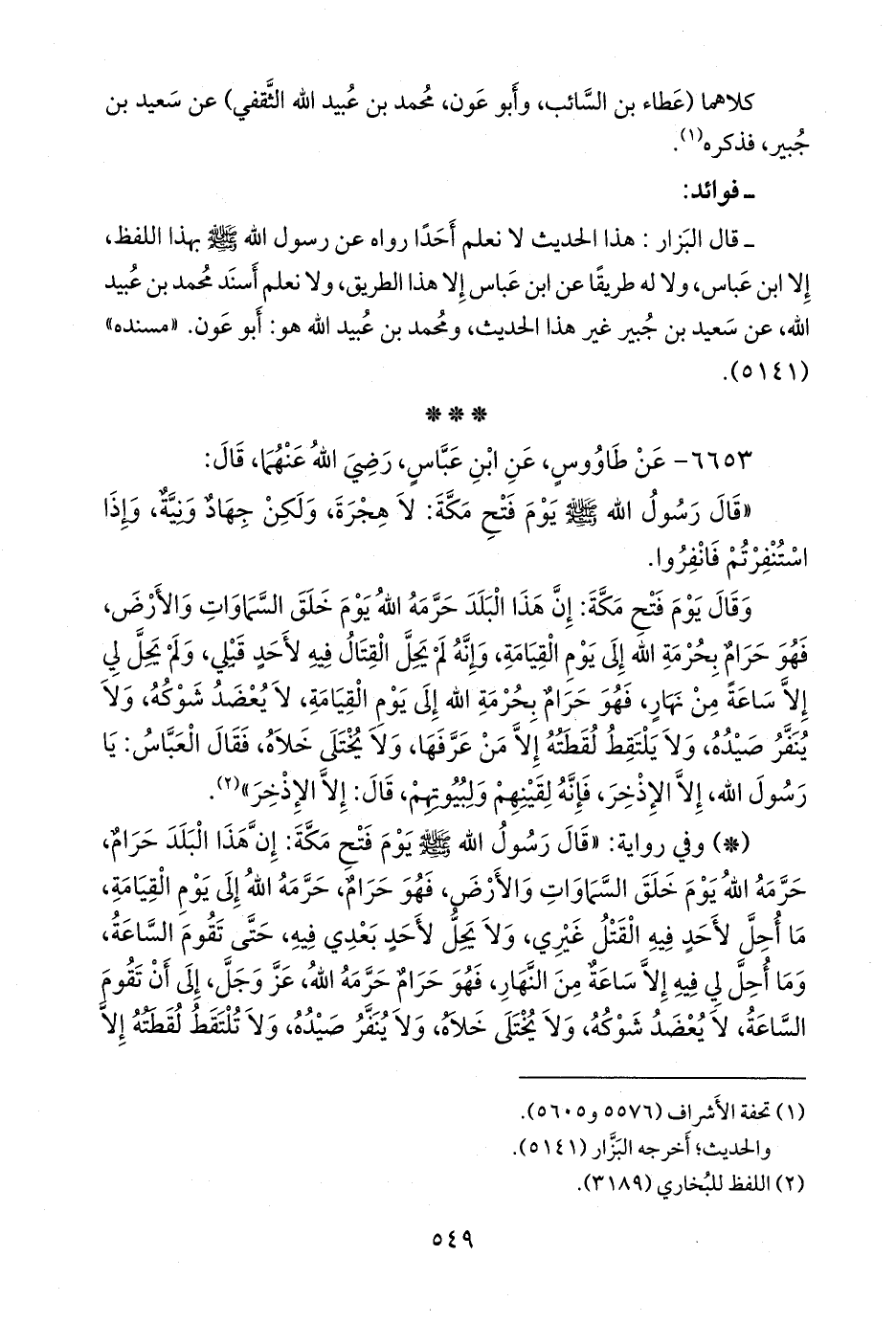 - وفي رواية: «قال رسول الله صَلى الله عَليه وسَلم يوم فتح مكة: إن هذا البلد حرام، حرمه الله يوم خلق السماوات والأرض، فهو حرام، حرمه الله إلى يوم القيامة، ما أحل لأحد فيه القتل غيري، ولا يحل لأحد بعدي فيه، حتى تقوم الساعة، وما أحل لي فيه إلا ساعة من النهار، فهو حرام حرمه الله، عز وجل، إلى أن تقوم الساعة، لا يعضد شوكه، ولا يختلى خلاه، ولا ينفر صيده، ولا تلتقط لقطته إلا